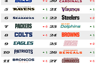 The Chiefs stay on top despite the loss, with the Bills up to No. 2