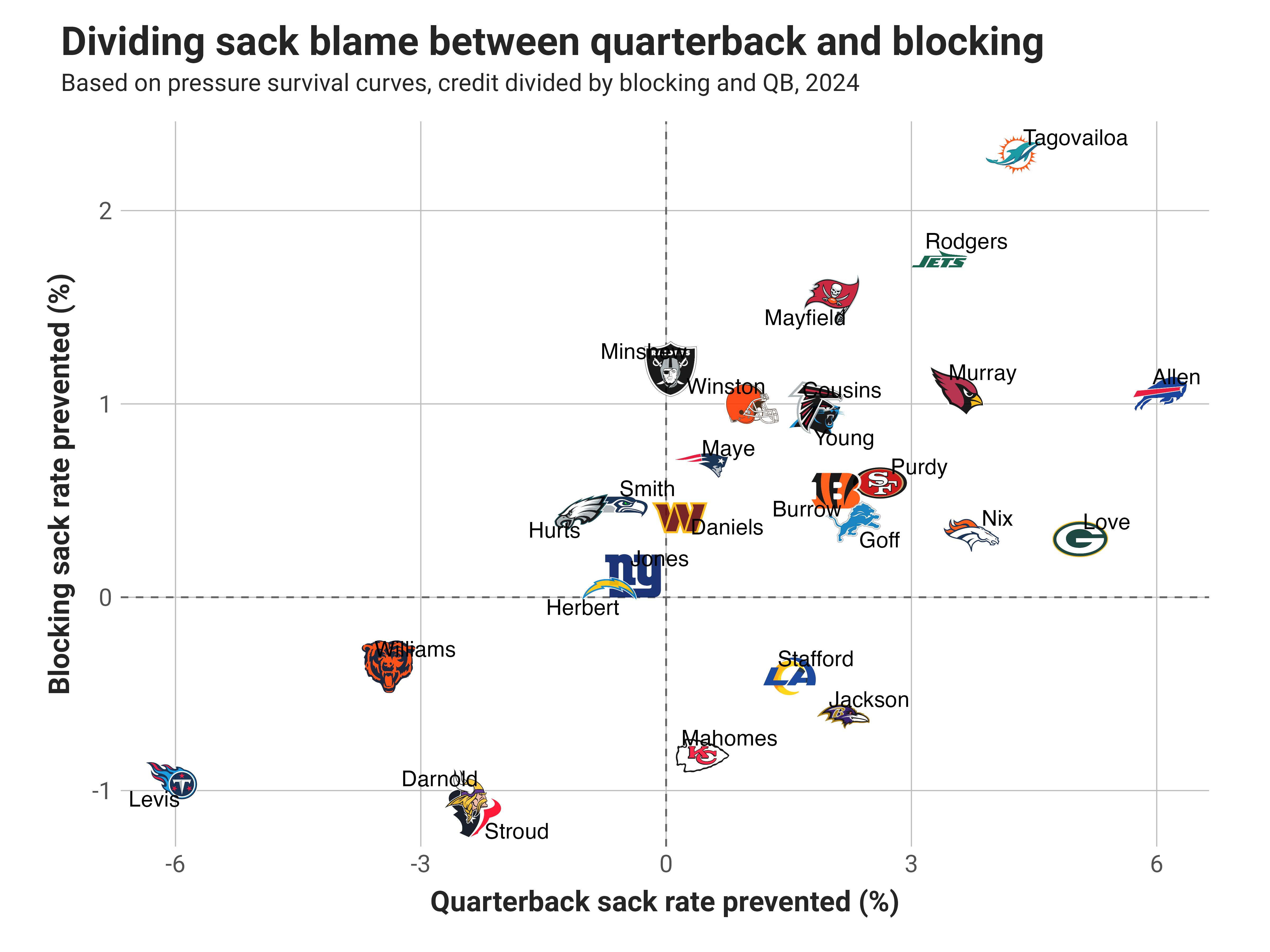Sacks caused/prevented by blocking: I introduced this element in Week of 2024, using survival curve analysis that accounts for time-to-pressure, time-to-throw and contextual play elements from FTNData’s charting. Through this, I can divide sack credit/blame versus expectation into holding the ball too long (quarterback) and allowing pressure too quickly (offensive line). I back out the portions belonging to blocking.