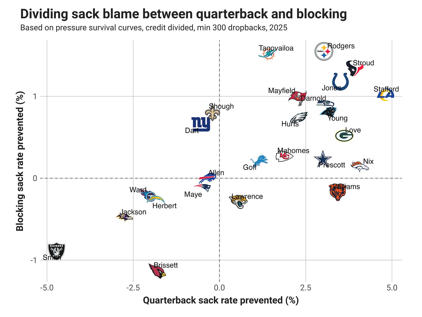 Sacks caused/prevented by blocking and scheme: I introduced this element in 2024, using survival curve analysis that accounts for time-to-pressure, time-to-throw and contextual play elements from FTNData’s charting. Through this, I can divide sack credit/blame versus expectation into holding the ball too long (quarterback) and allowing pressure too quickly (offensive line). I back out the portions belonging to blocking.