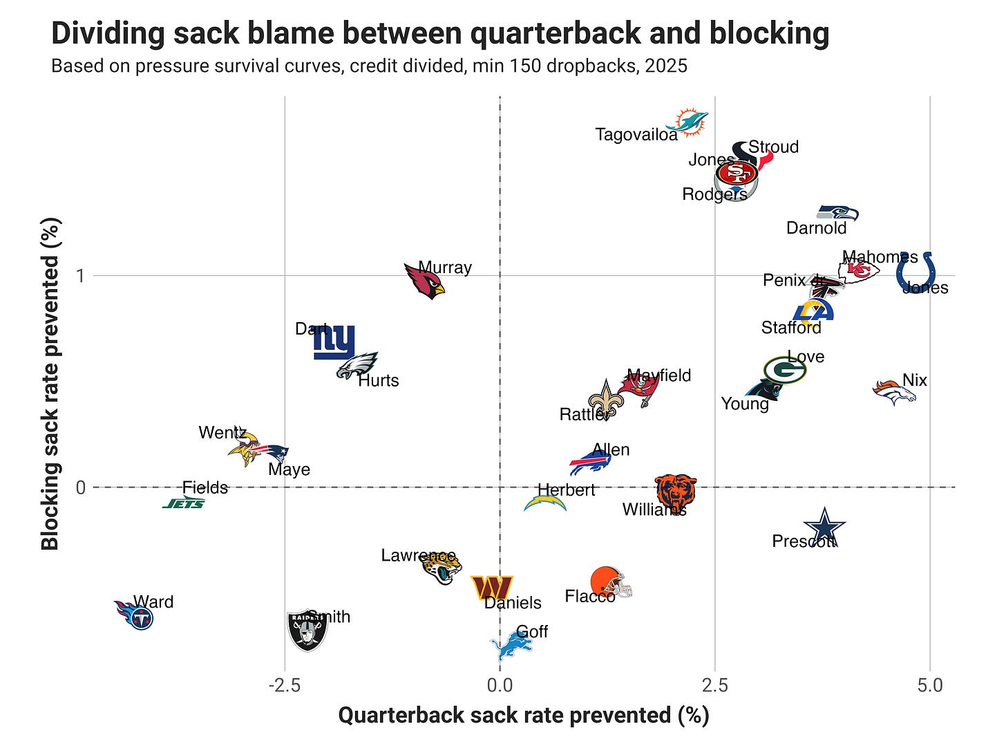Sacks caused/prevented by blocking: I introduced this element in 2024, using survival curve analysis that accounts for time-to-pressure, time-to-throw and contextual play elements from FTNData’s charting. Through this, I can divide sack credit/blame versus expectation into holding the ball too long (quarterback) and allowing pressure too quickly (offensive line). I back out the portions belonging to blocking.