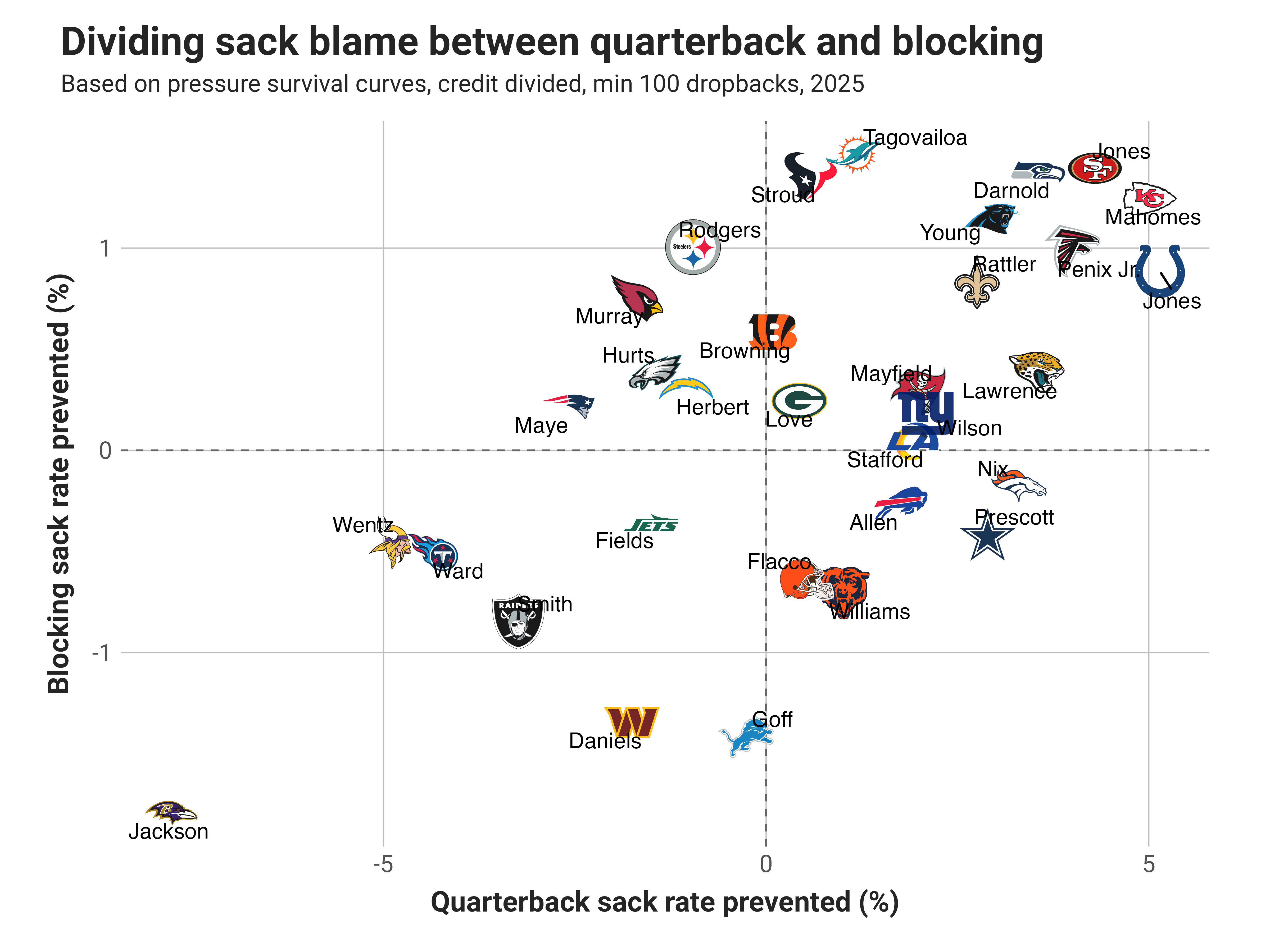 Sacks caused/prevented by blocking: I introduced this element in 2024, using survival curve analysis that accounts for time-to-pressure, time-to-throw and contextual play elements from FTNData’s charting. Through this, I can divide sack credit/blame versus expectation into holding the ball too long (quarterback) and allowing pressure too quickly (offensive line). I back out the portions belonging to blocking.