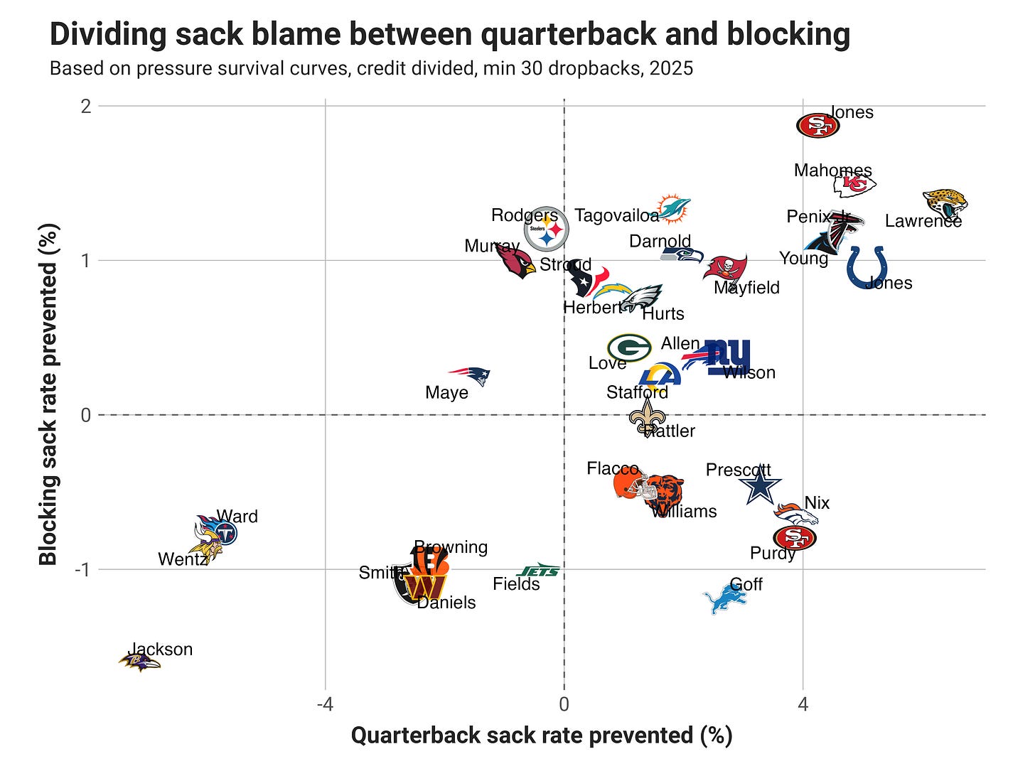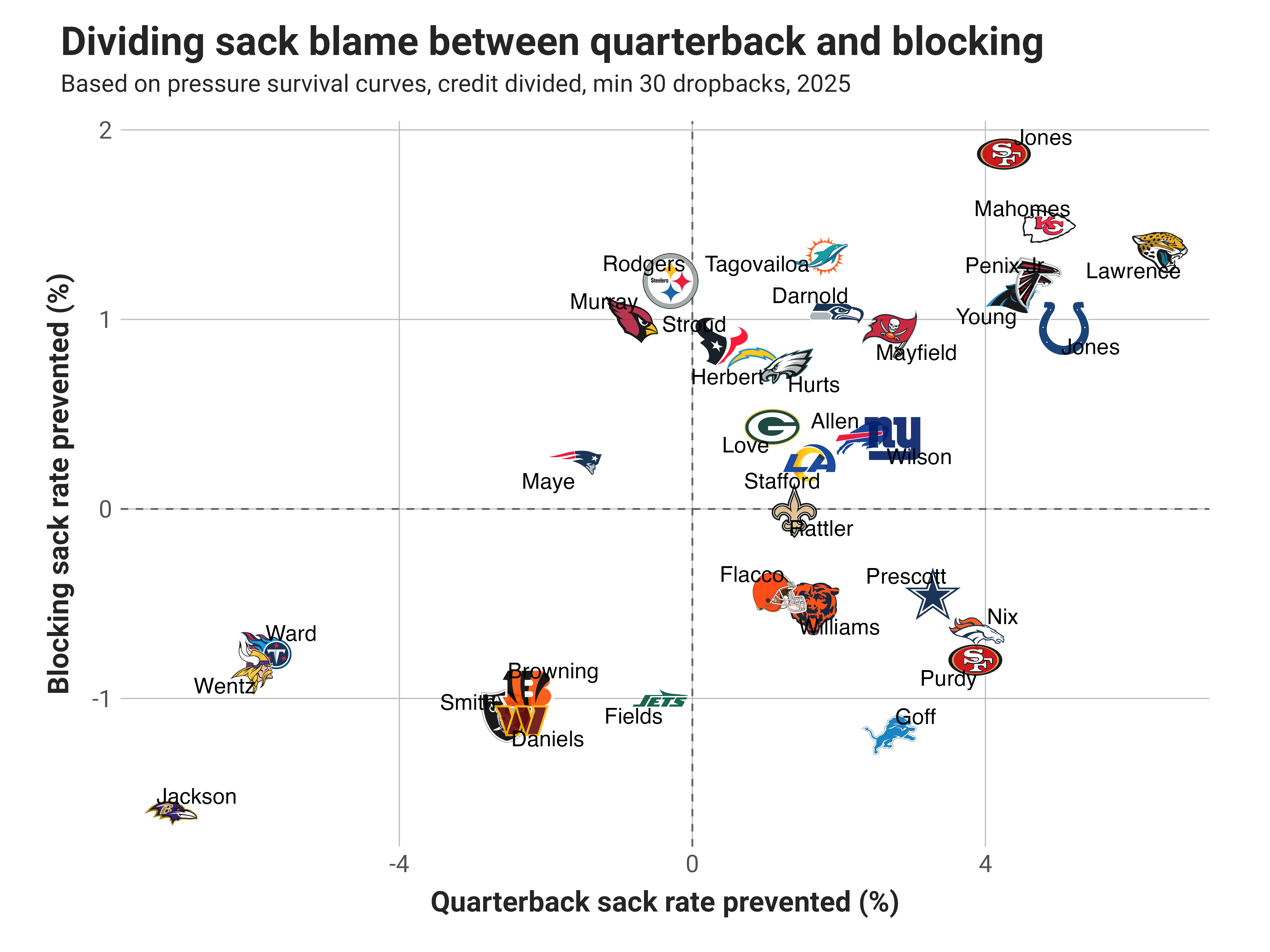 Sacks caused/prevented by blocking: I introduced this element in 2024, using survival curve analysis that accounts for time-to-pressure, time-to-throw and contextual play elements from FTNData’s charting. Through this, I can divide sack credit/blame versus expectation into holding the ball too long (quarterback) and allowing pressure too quickly (offensive line). I back out the portions belonging to blocking.