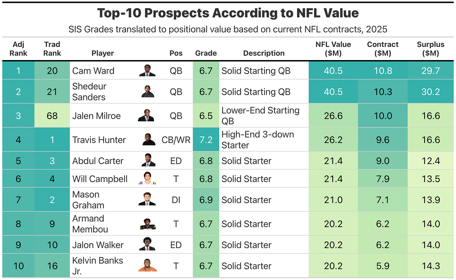 Cam Ward ranks all the way down at 20th overall when sorting based purely on position-independent grades, though he’s a lock to go No. 1 in the NFL draft. This analysis agrees with his likely draft slot, as a “Solid Starting QB” is worth around $40 million per season in today’s NFL, a significant cost saving from the No. 1 pick’s rookie annual contract cost of $10.8 million.