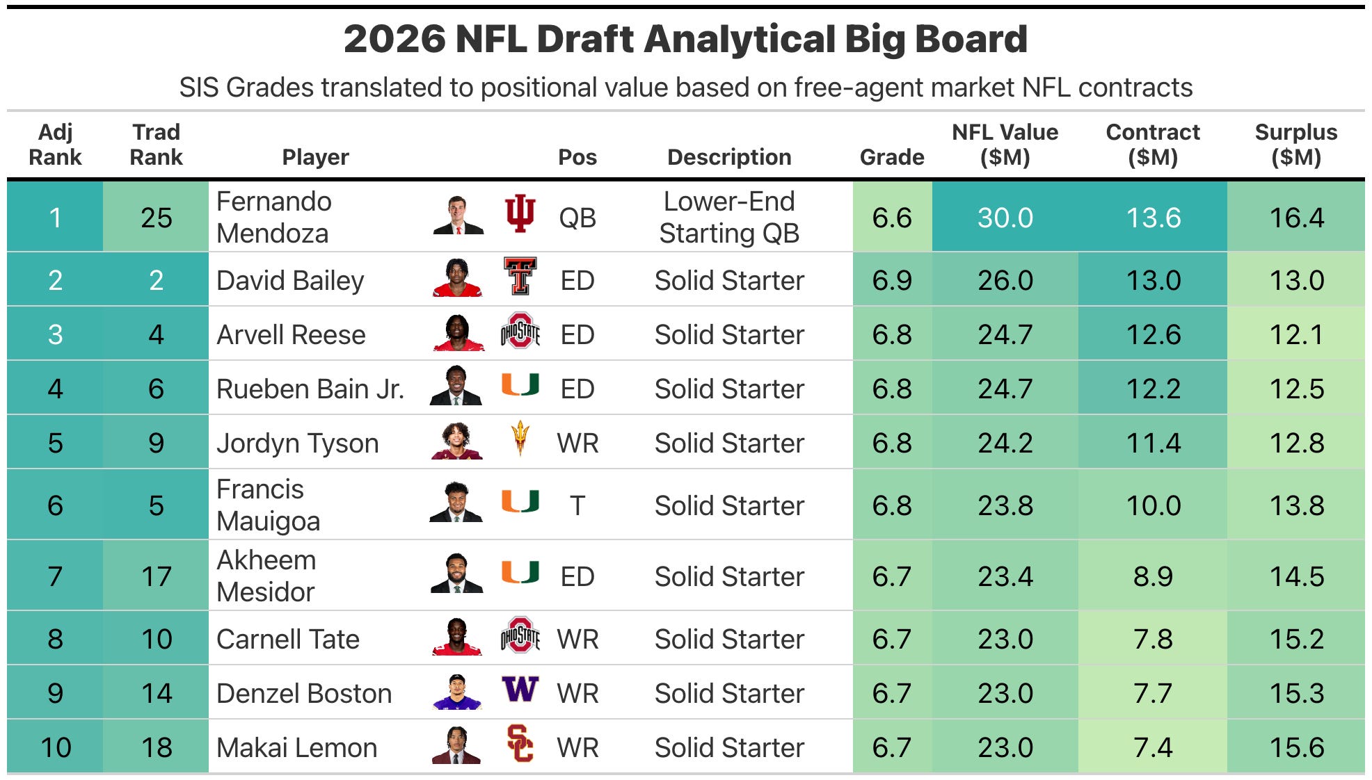 Rather than continuing to complain on social media about what others are doing, I decided to build my own Big Board for the 2026 NFL draft, leveraging the outstanding prospect grades from Sports Info Solutions (SIS), which you can find on their website. What I’m doing here is combining the best of the prospect-grading world, with analytical concepts of NFL value and surplus value based on position, which has been a big focus of my own research.