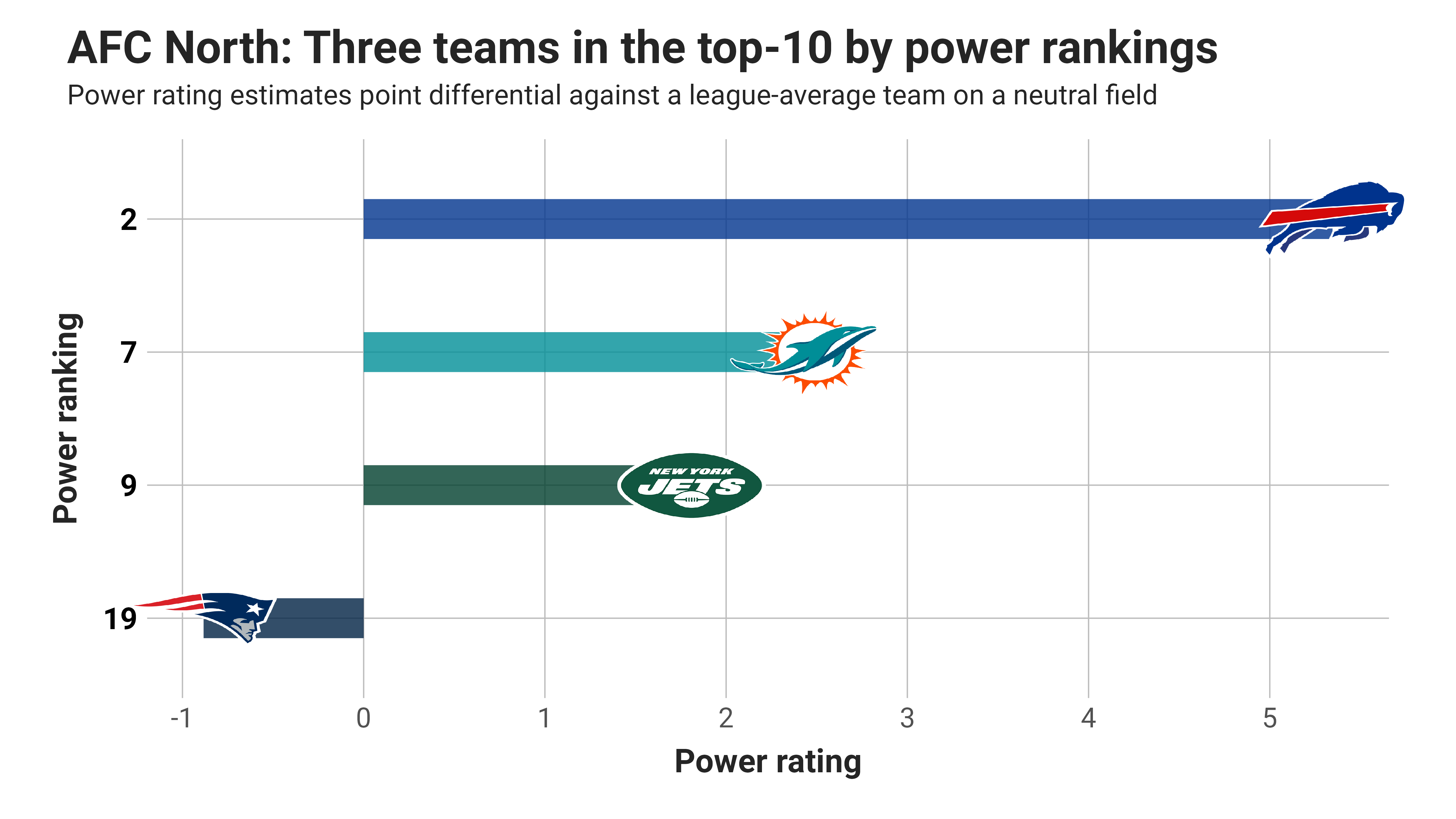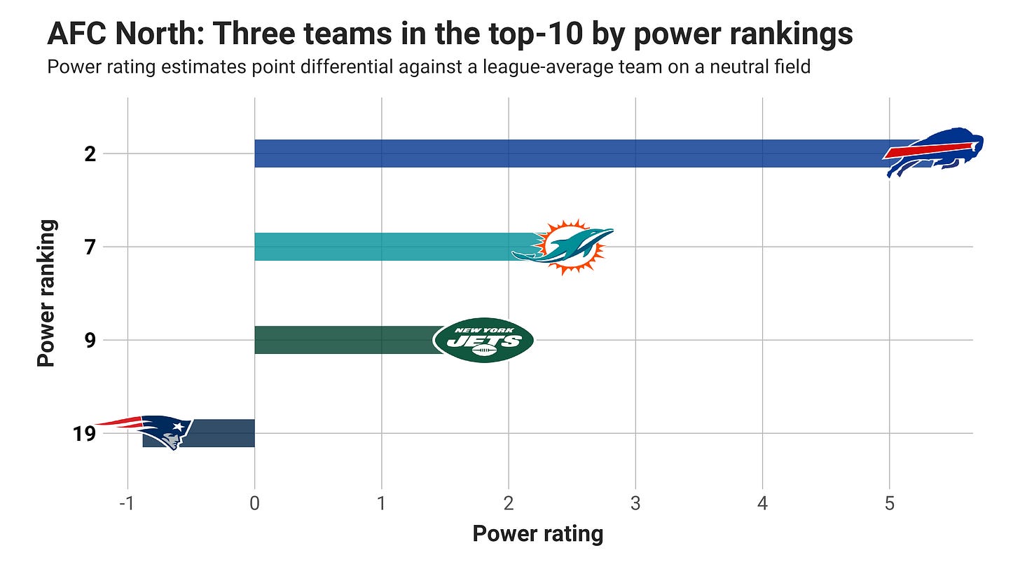 The AFC East is the strongest division in the NFL, according to my aggregate power rankings. The worst team in the division, the New England Patriots, are the only below-average squad, and then only slightly so. The Buffalo Bills, Miami Dolphins and New York Jets all profile as top-10 teams, though perhaps in a different order than some expect.