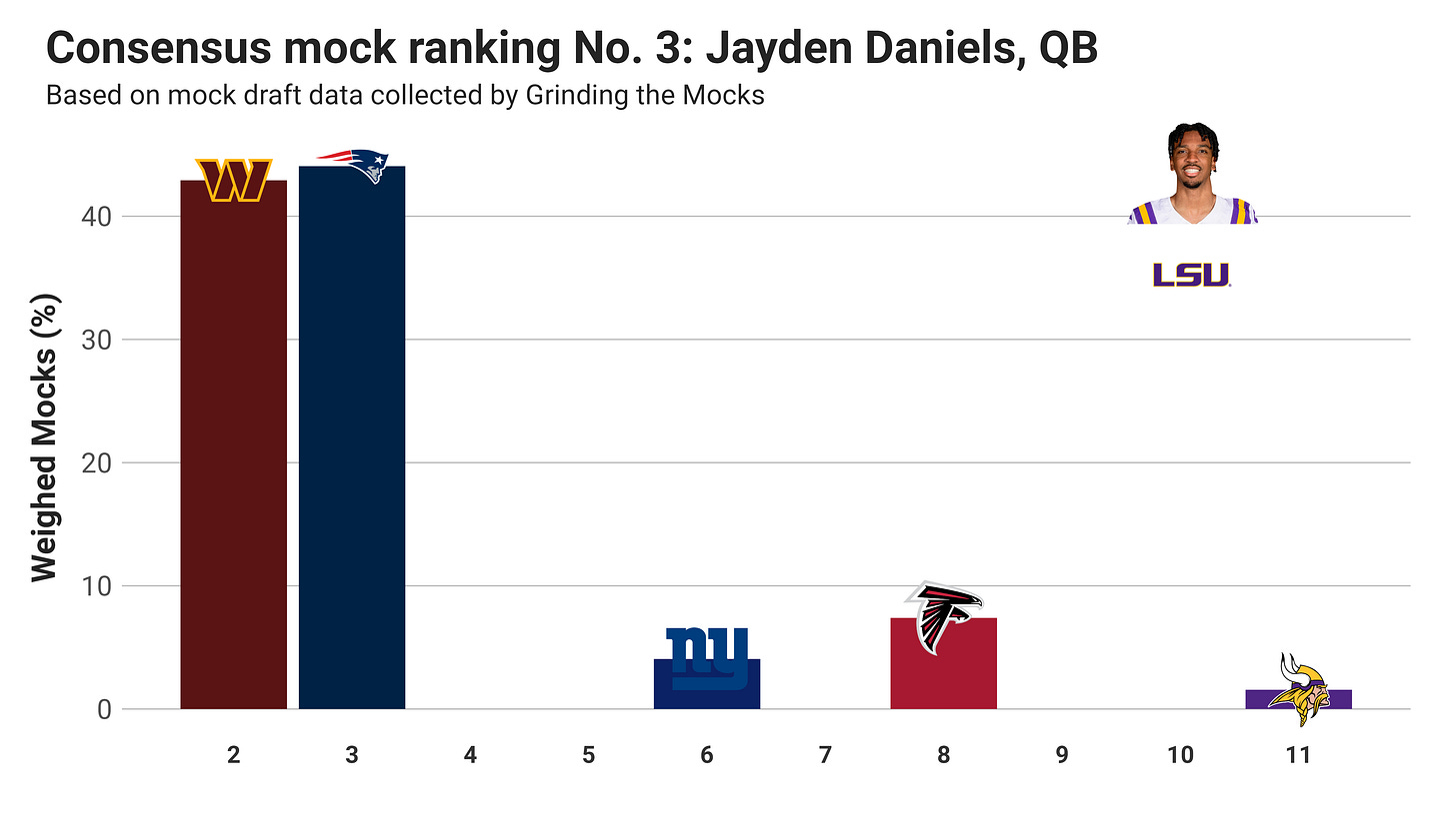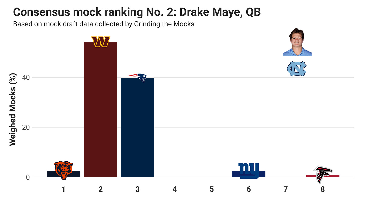 Drake Maye is still holding on to the No. 2 position in the consensus mock, but his stock has been falling vis-a-vis Jayden Daniels in recent weeks. The Commanders are still the most likely team to take Maye with the second pick according to recent mock drafts, but the Patriots are very close.