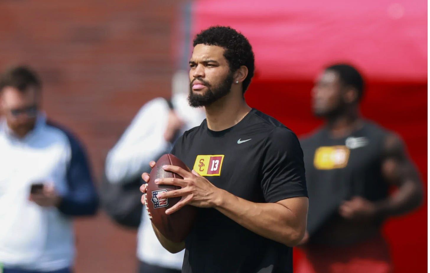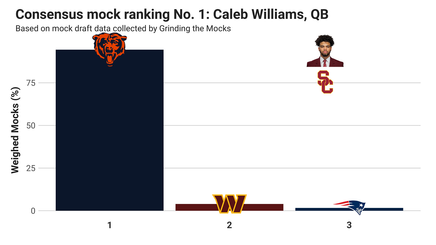 Nearly all mock drafts have the Bears using their No. 1 pick on Caleb Williams, with a few throwing in trades that would result in Williams going to the Commanders or Patriots. Despite the NFL media leaning into the perception that the Bears were conflicted in the early preseason, this newsletter has always assumed that Williams to the Bears was a sure thing and the Fields-versus-Williams debate was pointless.