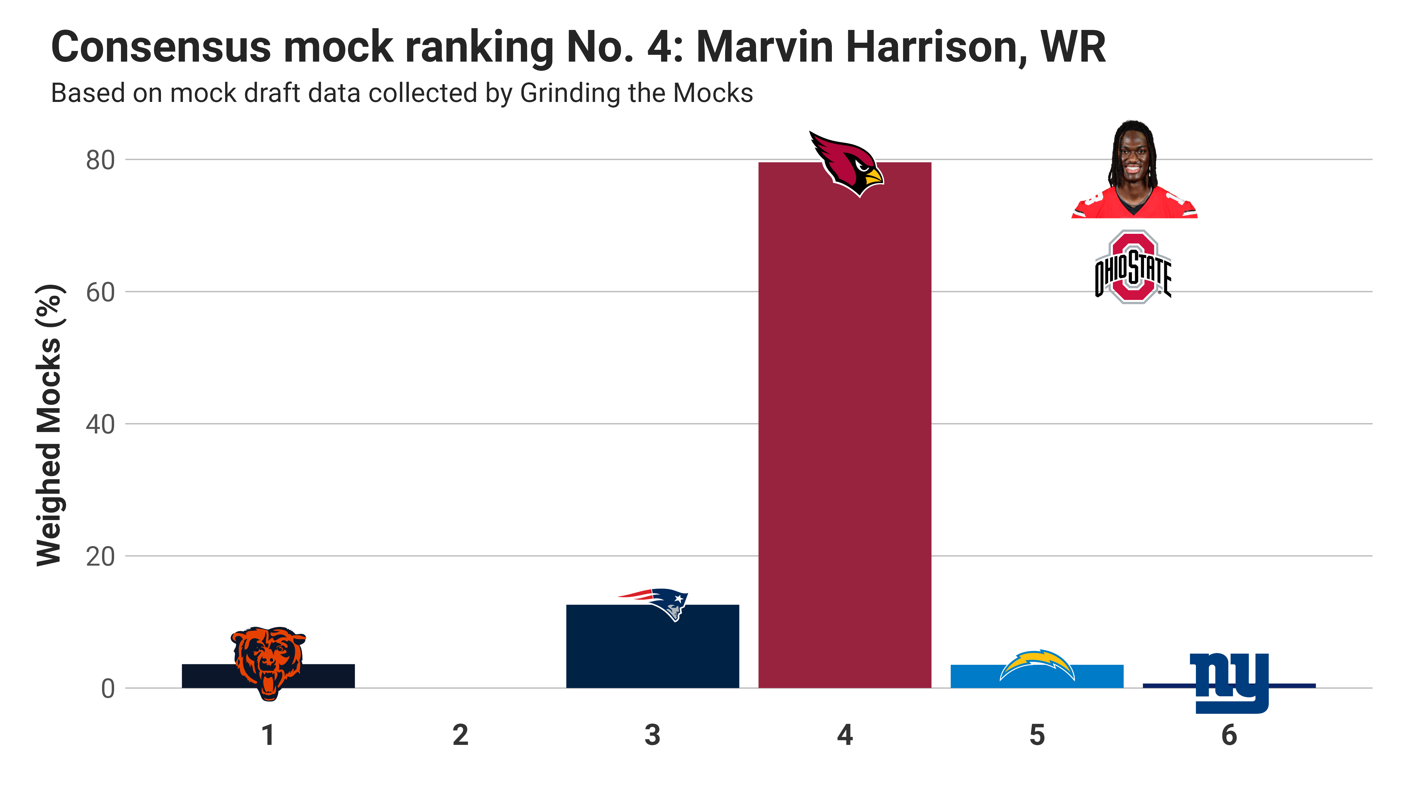 The selections for Marvin Harrison Jr. are tightly packed near the top of the draft, an impressive feat when so many assume quarterbacks will be taken 1-2-3. I’m not buying the chance that the Bears or Patriots pass on a quarterback, but some mock drafters have gotten creative and see a chance the Bears will trade down.