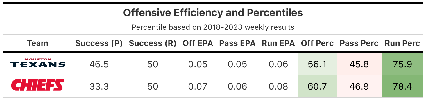 Even the straight EPA efficiency numbers were basically the same between the two teams, despite the penalty advantages included in them. The Texans were much more successful offensively on a play-by-play basis, posting positive EPA on 48% of plays to the Chiefs at only 39%.
