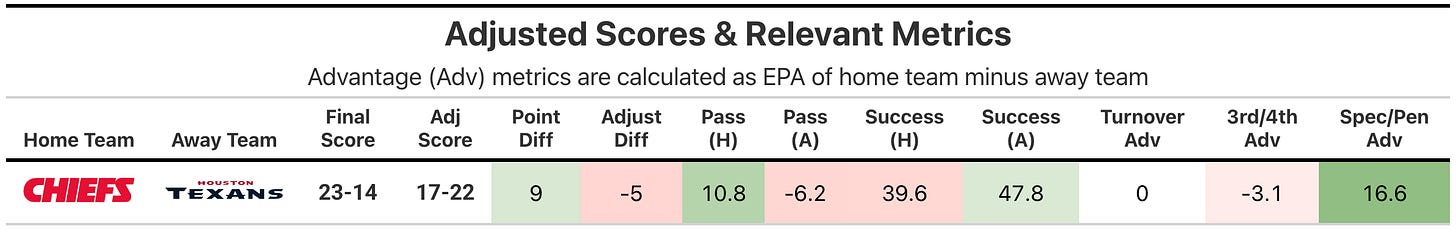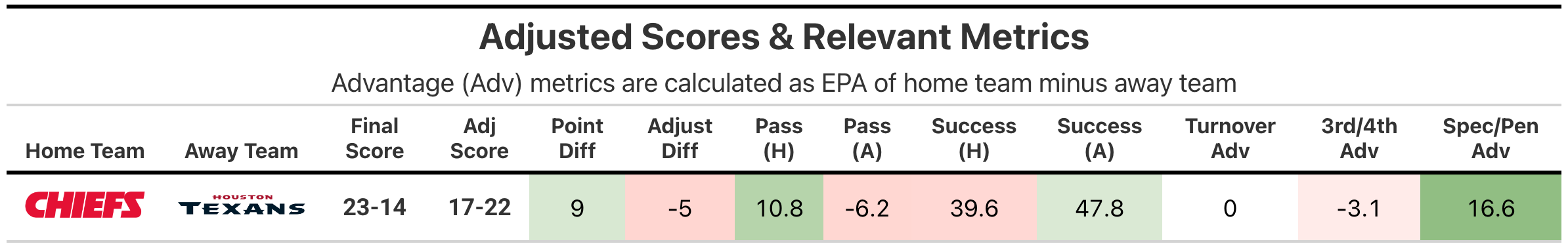 There’s already more talk about the referee calls in this game than the rest of the play, and the adjusted scores agree, without even “watching” the game, that the result went the wrong direction. The Kansas City Chiefs won by a comfortable looking nine points, but were fundamentally five points worse than the Houston Texans by my numbers. Unsurprisingly, it all came down to huge advantages the Chiefs had with penalties and special teams, totaling +16.6 expected points across those categories.