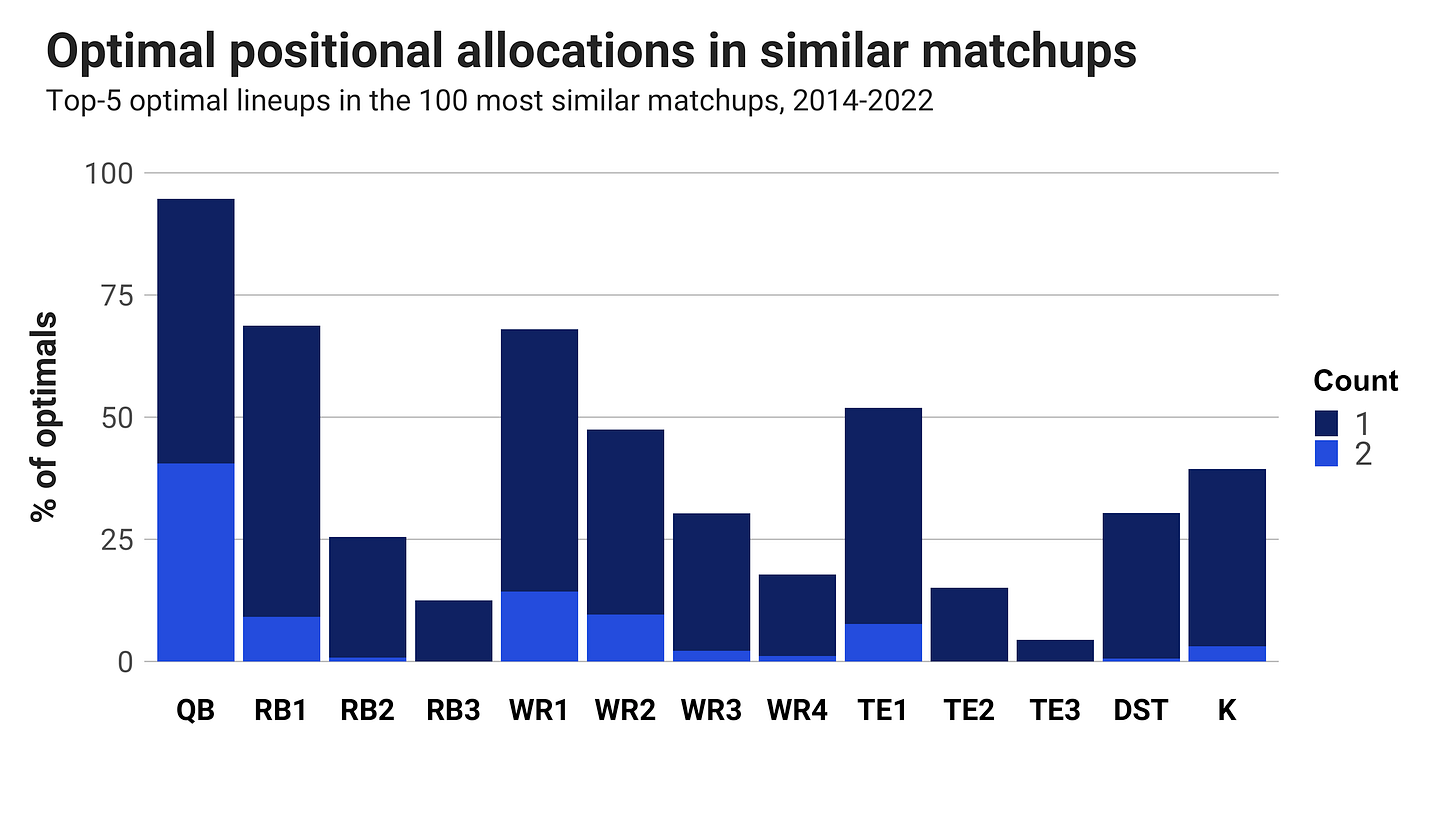 • Optimal lineup allocations (CPT and total roster) for both teams based on the results of similar historical matchups.