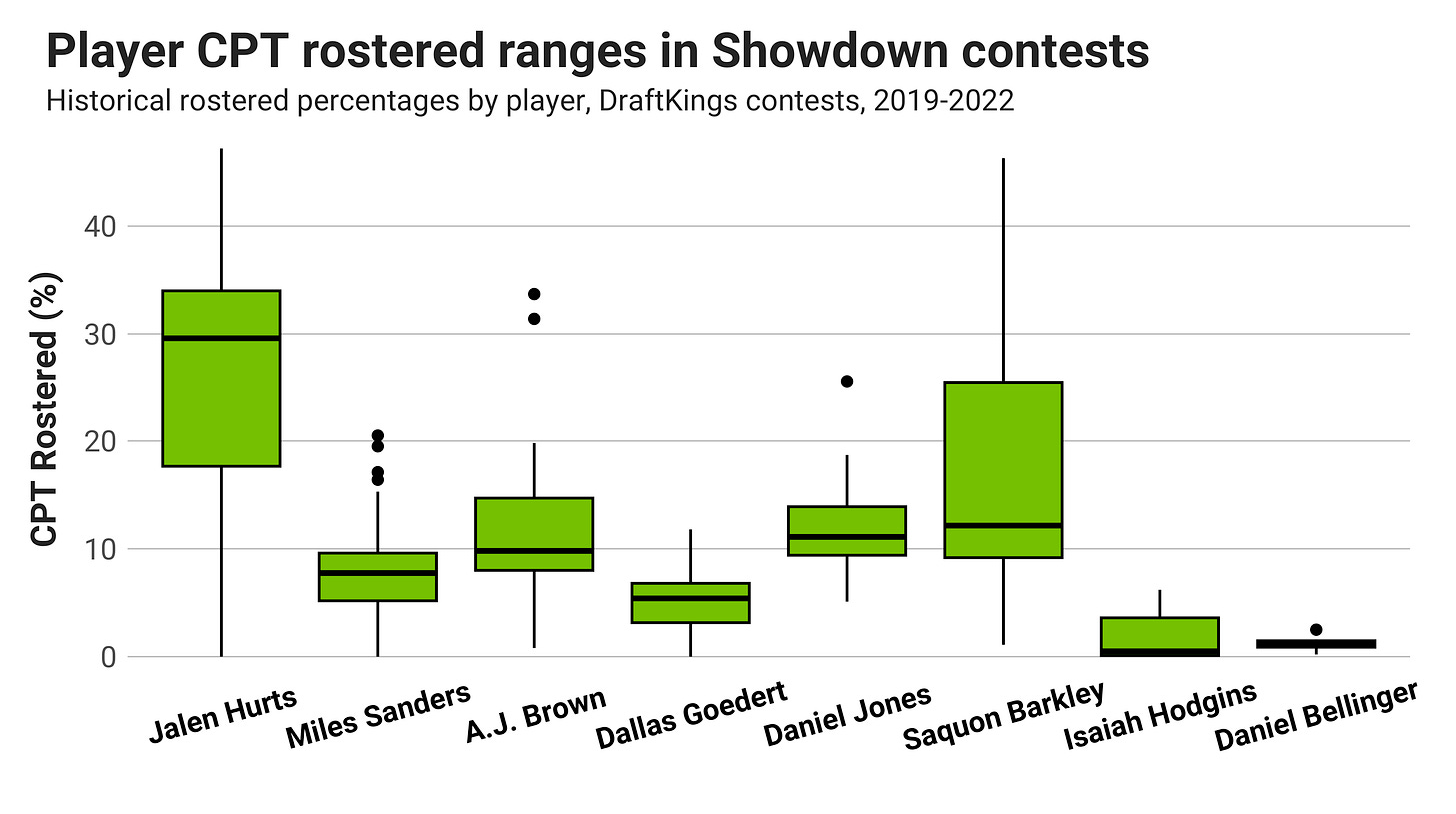 The boxplot below shows the ranges for CPT ownership for each starting player in contests since 2019. Outlier results are indicated by dots, with the bottom of the box, the line through the middle, and the top of the box reflecting the first quartile, median and third quartile of each player’s ownership distribution.