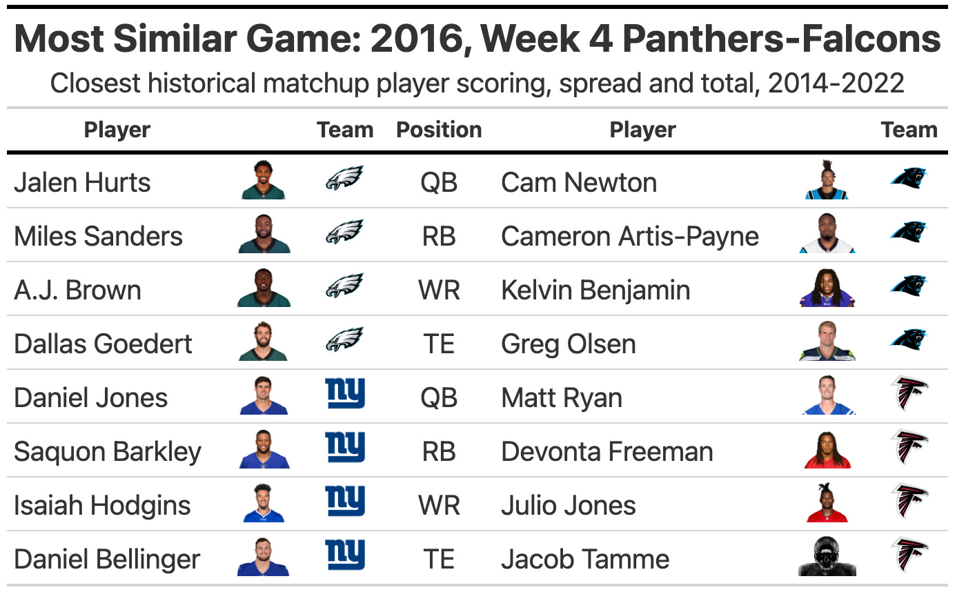 • A breakdown of methodology and the most similar historical matchup to this game: 2016, Week 4 Panthers-Falcons, with Cam Newton as Jalen Hurts, Greg Olsen as Dallas Goedert and Matt Ryan playing the role of Daniel Jones.
