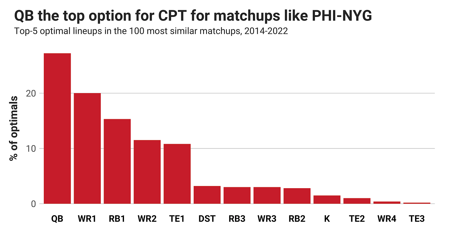 The spread and over/under are somewhat similar in these matchups (Panthers -2.5, 48.5 O/U versus this matchup at Eagles -7.5, 48 O/U). All the players aren’t perfect matches, but that’s why we use 100 similar matchups and not just the single most similar.