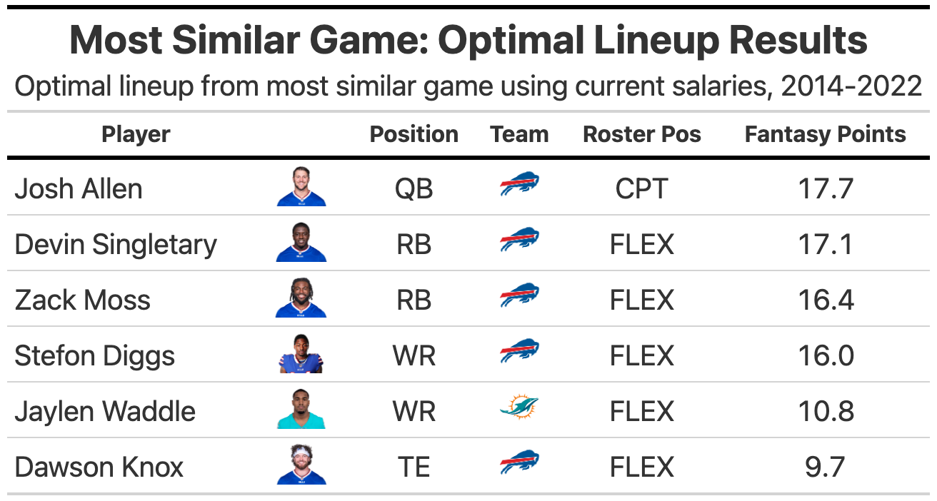 The spread and over/under are somewhat similar in these matchups (Bills -3.5, 48 O/U versus this matchup at Eagles -3, 45.5 O/U). All the players aren’t perfect matches, but that’s why we use 100 similar matchups and not just the single most similar.