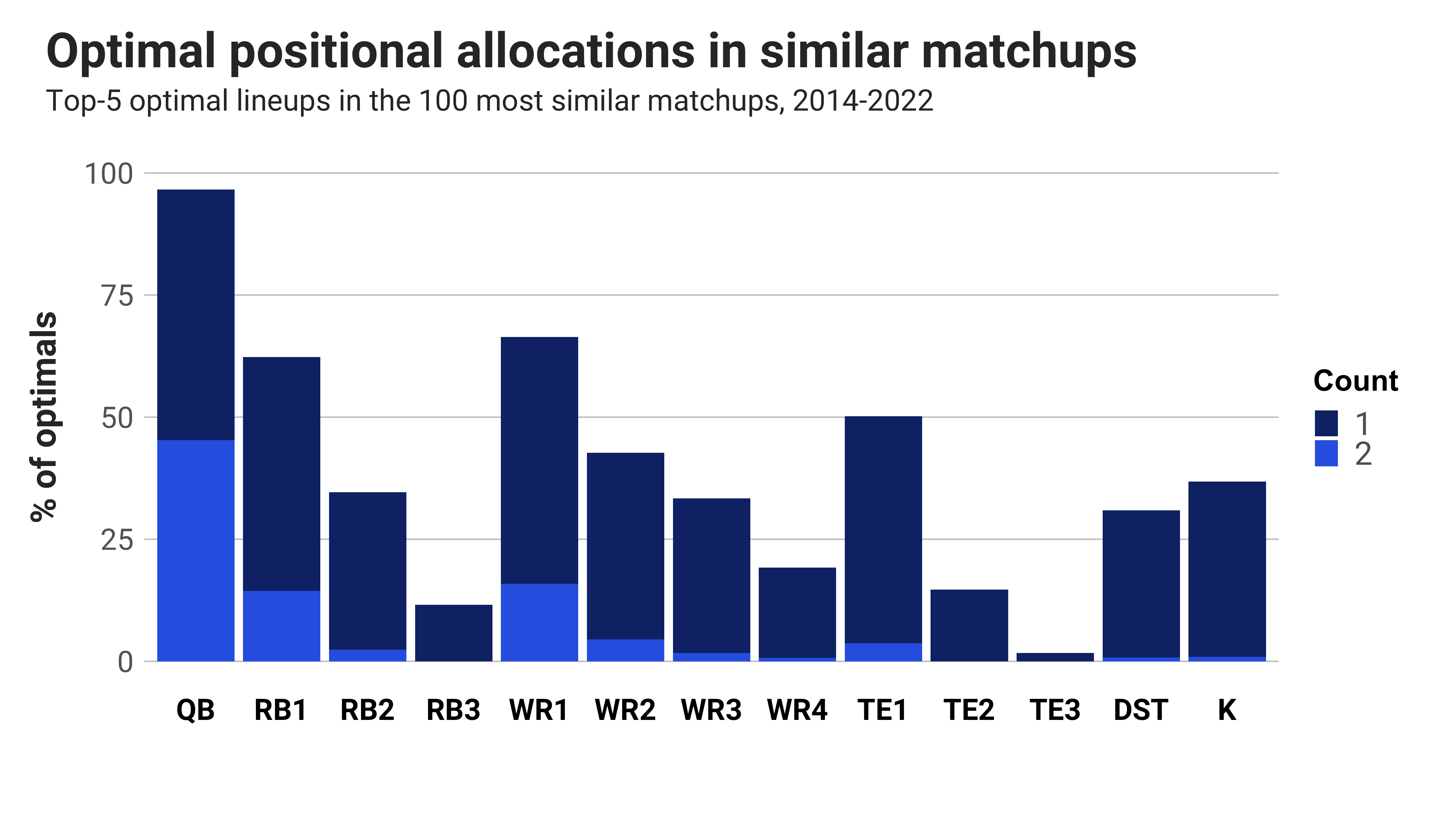 This graph illustrates the full range of allocations for the different positions to measure how many of the 500 optimal rosters had exactly zero, one or two of the given positions.