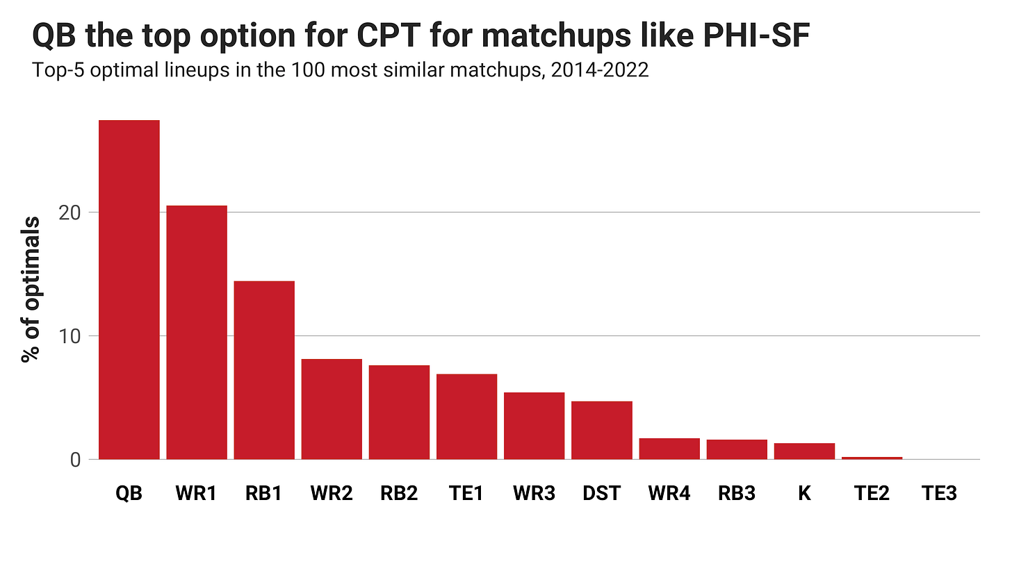 I went through the millions of possible lineup combinations for the 100 most similar matchups and found who the CPT selections were on the top-five scoring lineups for each matchup. Here are the 500 CPT choices from those matchups by position rank according to salary.