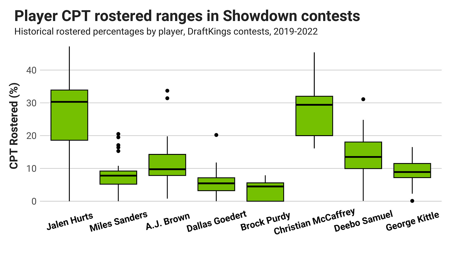 The boxplot below shows the ranges for CPT ownership for each starting player in contests since 2019. Outlier results are indicated by dots, with the bottom of the box, the line through the middle, and the top of the box reflecting the first quartile, median and third quartile of each player’s ownership distribution.