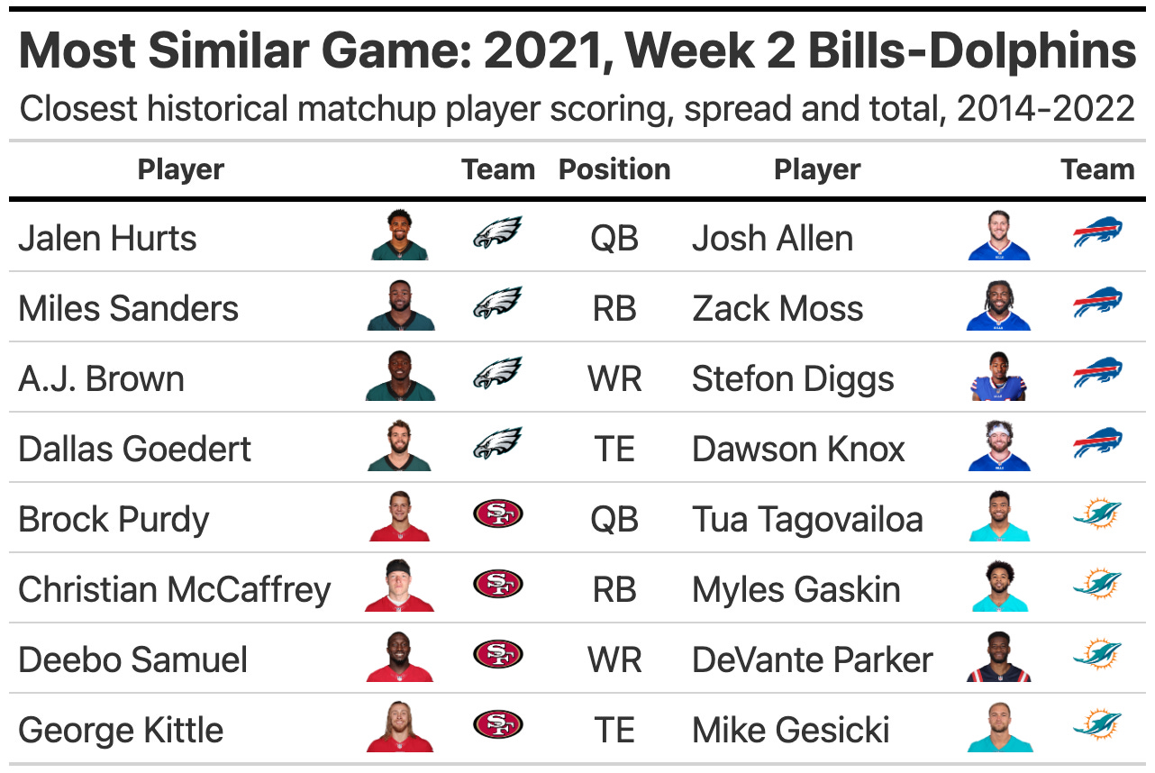 • A breakdown of methodology and the most similar historical matchup to this game: 2021 Week 2 Bills-Dolphins, with Josh Allen and Stefon Diggs as Jalen Hurts and A.J. Brown, and Tua Tagovailoa playing the role of Brock Purdy.