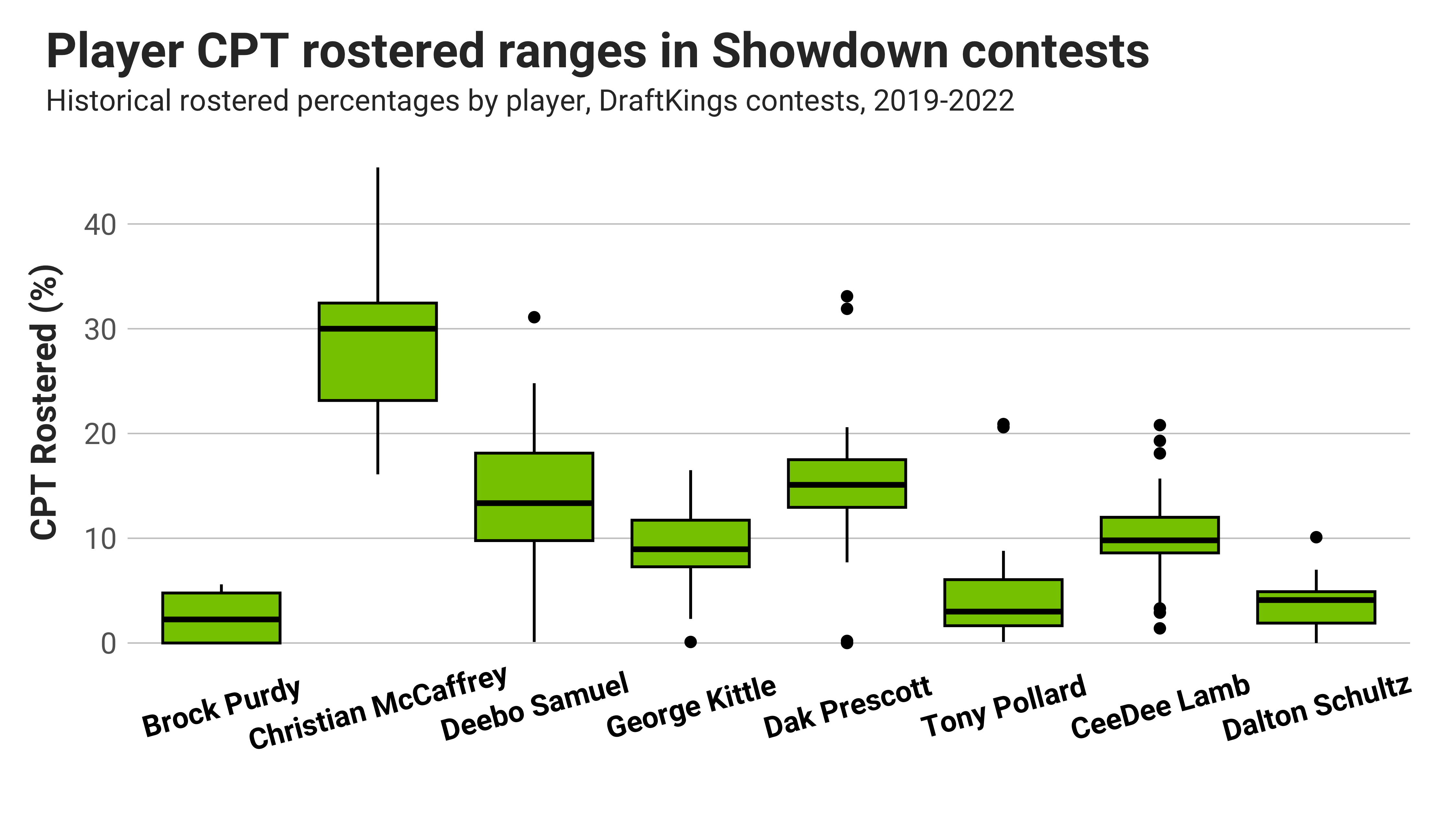 The boxplot below shows the ranges for CPT ownership for each starting player in contests since 2019. Outlier results are indicated by dots, with the bottom of the box, the line through the middle, and the top of the box reflecting the first quartile, median and third quartile of each player’s ownership distribution.