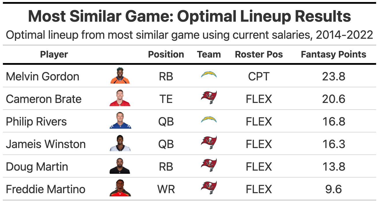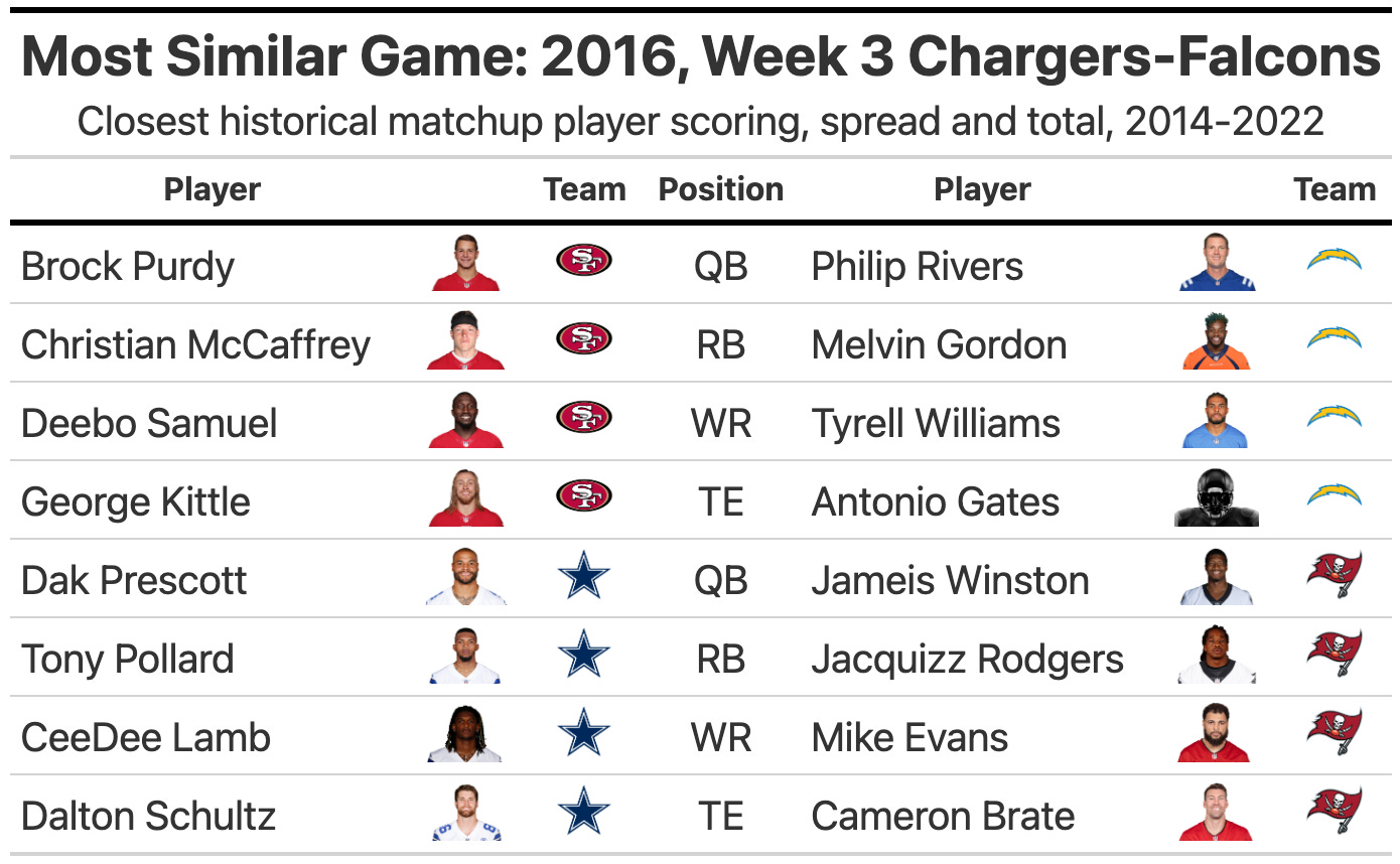 • A breakdown of methodology and the most similar historical matchup to this game: 2016 Week 3 Chargers-Falcons, with Philip Rivers, Melvin Gordon and Antonio Gates as Brock Purdy, Christian McCaffrey and George Kittle. Jameis Winston and Mike Evans playing the roles of Dak Prescott and CeeDee Lamb.
