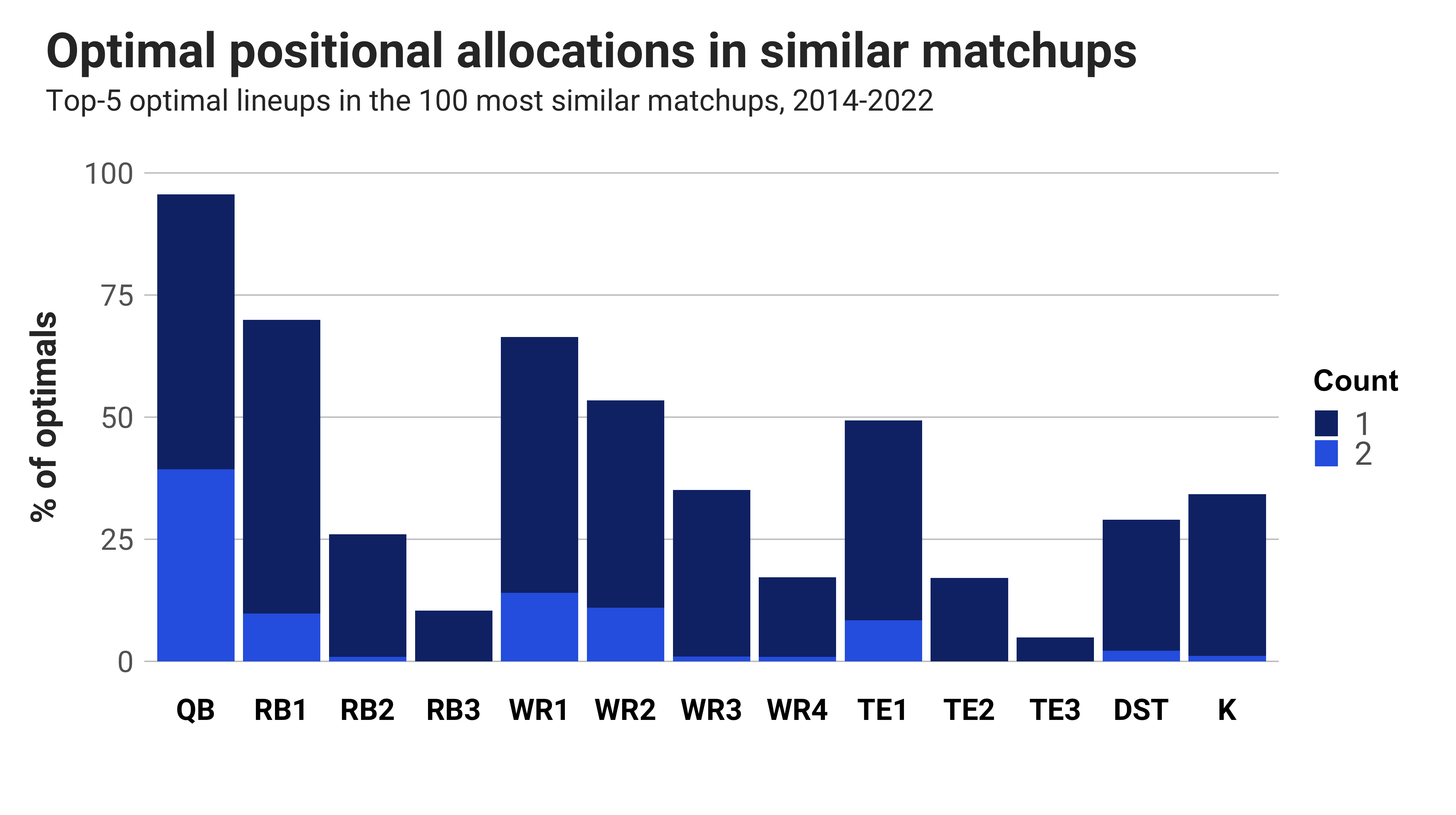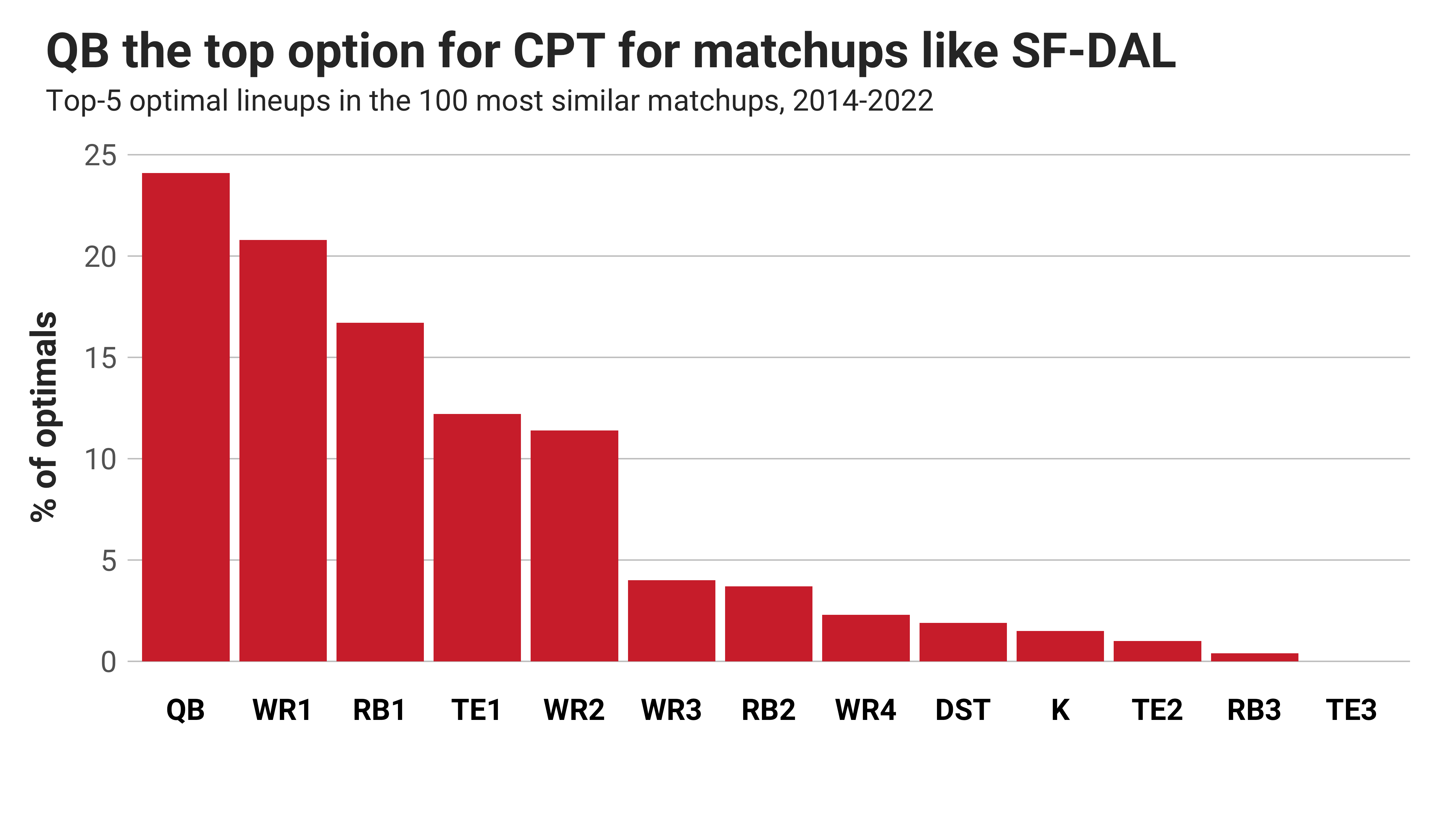 • Optimal lineup allocations (CPT and total roster) for both teams based on the results of similar historical matchups.