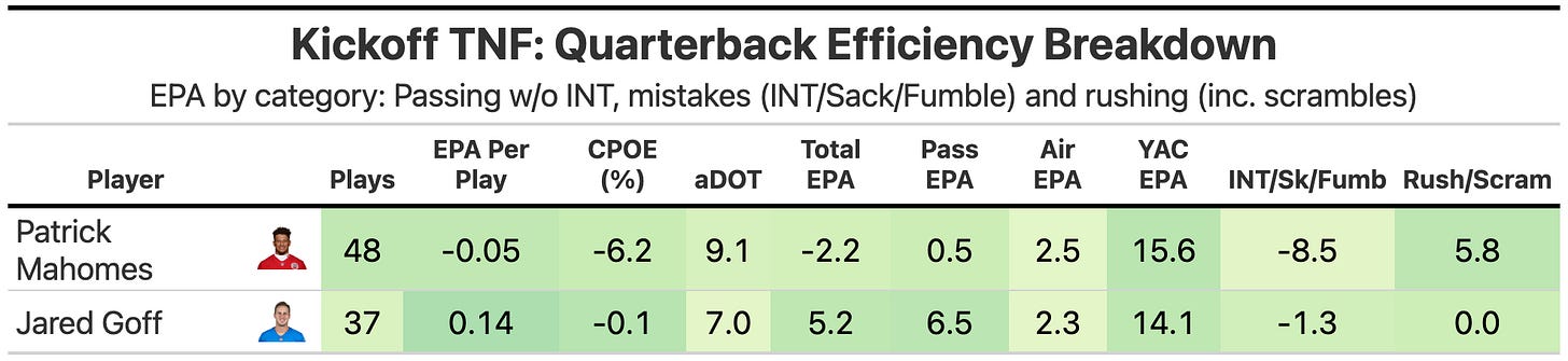 Jared Goff was workman-like in his efficiency and performance, exactly what you hope for. A key for Goff was making minimal mistakes (just one sack for three yards), and letting the receivers do a lot of work after the catch. Goff can’t consistently make plays happen on clutch downs, but a 3rd & 12 conversion to Josh Reynolds under pressure stood out, netting the Lions +2.8 EPA.