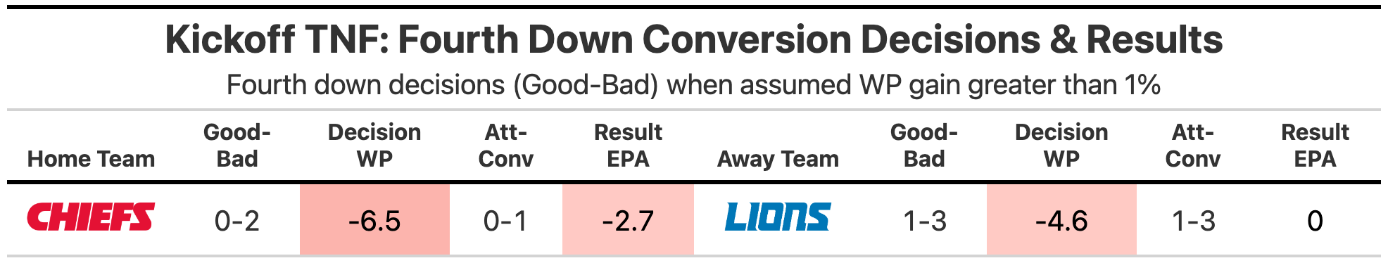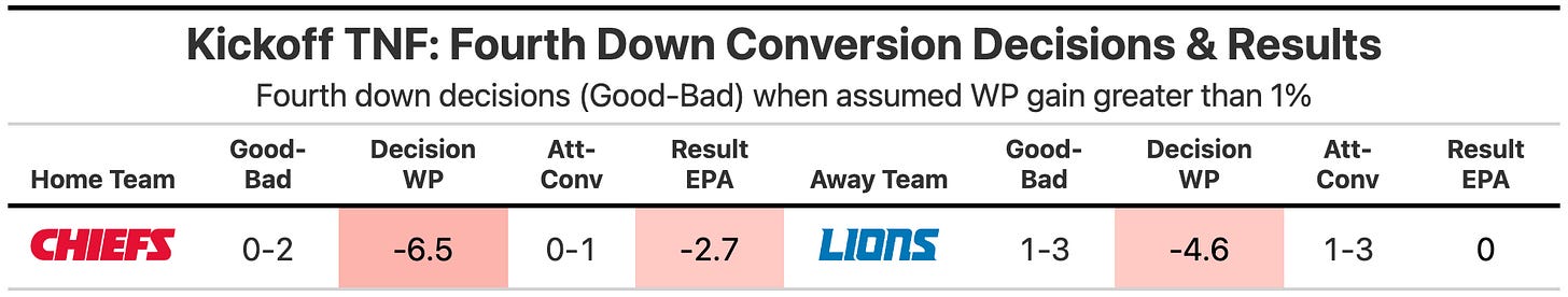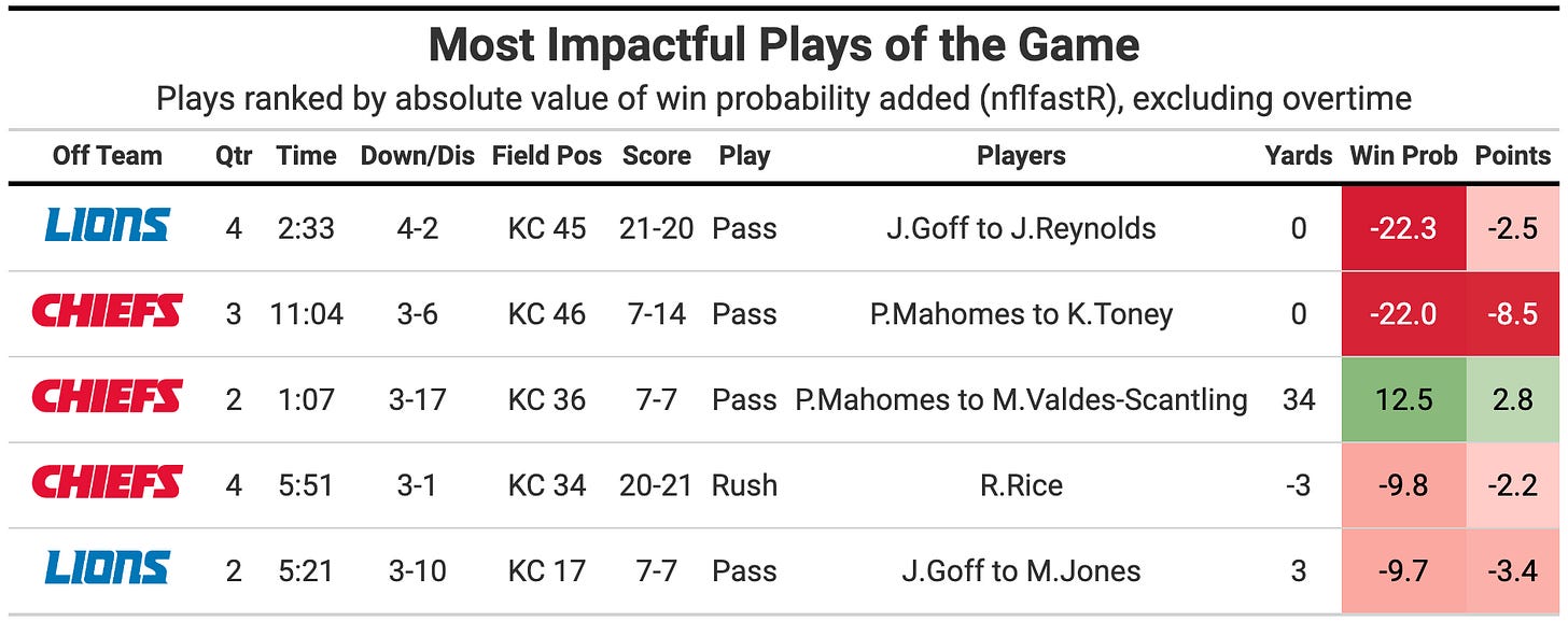 I have no clue what the processes where for both teams on 4th down decisions. It looked completely vibes based, which was expected from the Chiefs (normally Reid’s negative vibes), but somewhat disheartening from the Lions, a team that was properly aggressive for most of last season. The Lions faked a punt on fourth down inside their own 20 early (a good decision by the numbers), but then passed up a chance to go on 4th and 3 in a no-brainer field position on the Chiefs 40 (3.9% win probability lost).