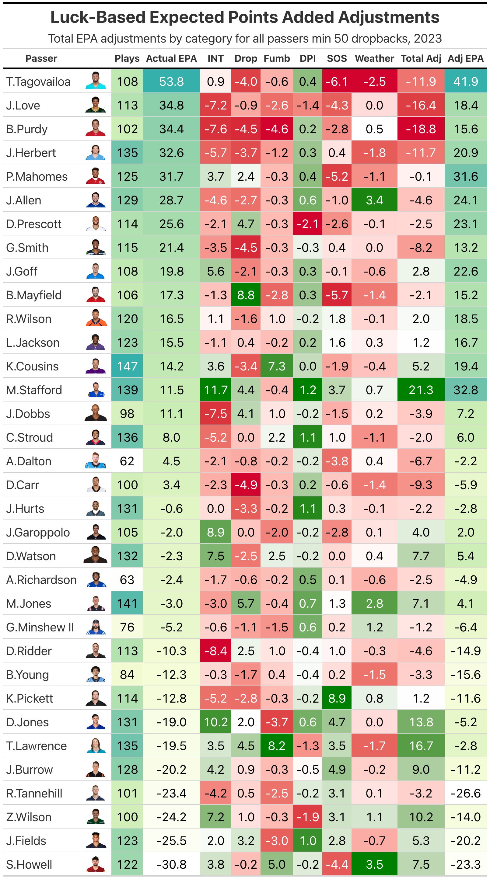 The biggest beneficiary from the luck-based adjustments is Matthew Stafford, who jumps all the way from 14th to second in total EPA. Stafford has had the worst luck with interceptions and interception returns (four INTs vs two charted worthy), his receivers have dropped a lot of balls (seven) and tougher schedule (Seahawks, 49ers, Bengals).