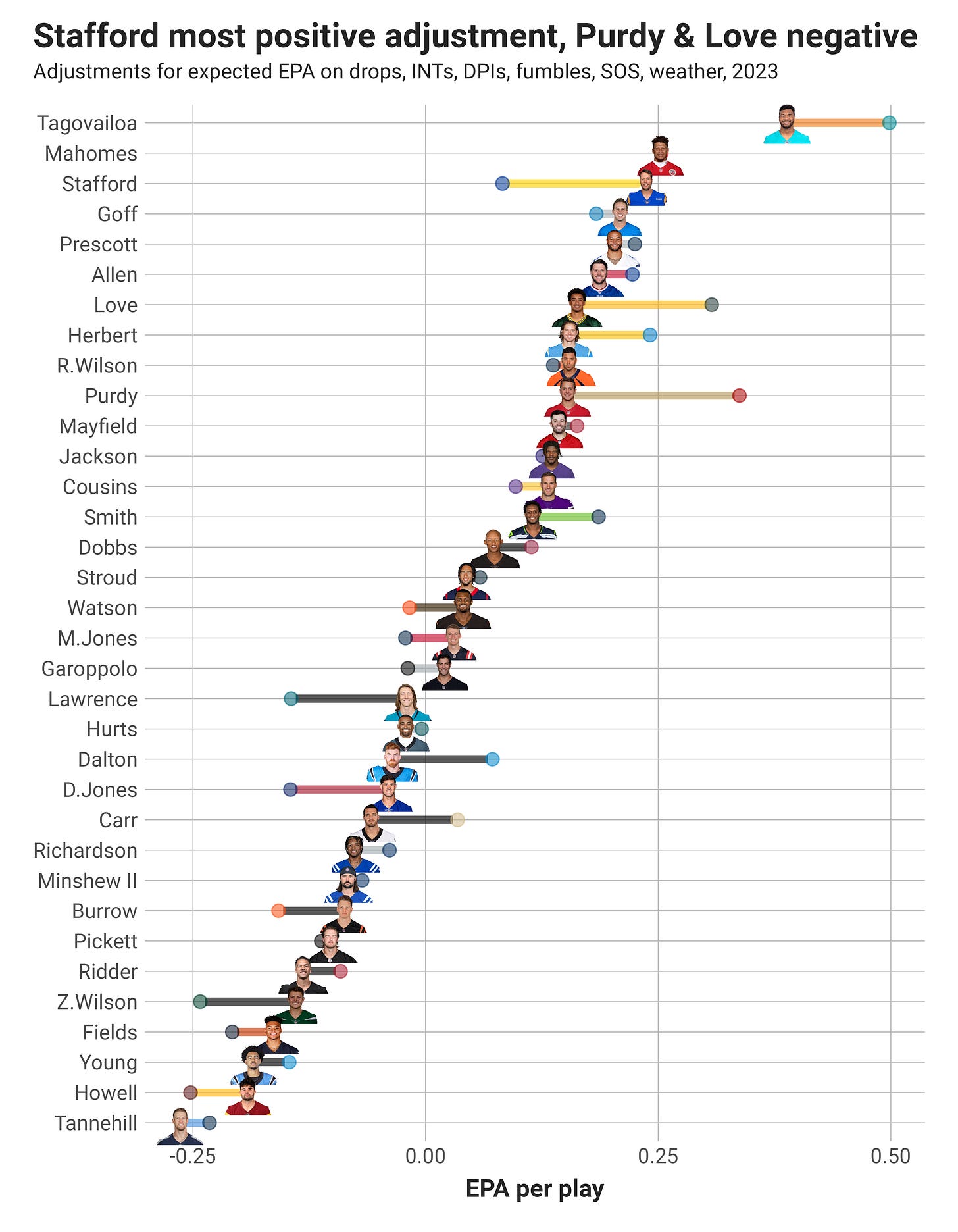 The plot below shows each quarterback who has dropped back to pass 50 times this season. There are two points for each quarterback: 1) The team-colored dot for the actual EPA per play the quarterback has this season and 2) The quarterback headshot representing the adjusted quarterback efficiency (EPA/play). There is also a team-colored line linking the two on each row.