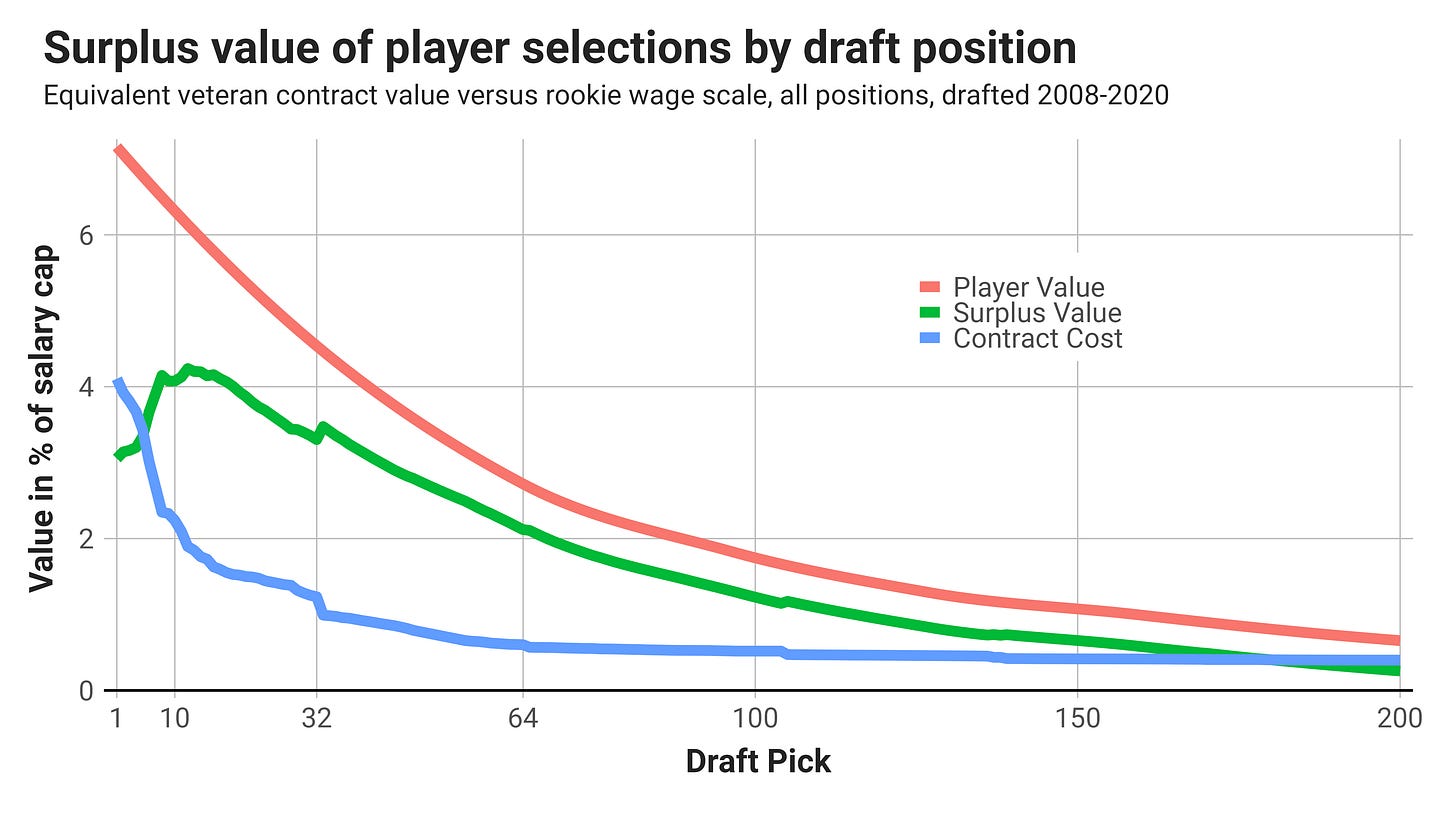 Traditional draft value charts show a blended average of expected player value by selection number, calculating surplus value by subtracting the fixed rookie contract costs. The player value numbers come from what equivalent players drafted in that position go on to make on their second contracts, giving teams the value of a “discount” with artificially lowered rookie contracts.