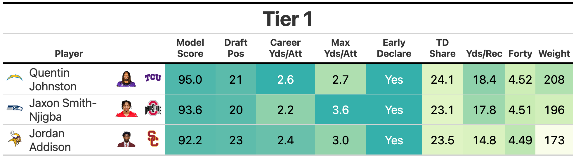 The features for each wide receiver in the models are as follows, ordered by relative importance and statistical significance. The stats are from the prospects’ best statistical season in which they played at least five games and logged at least 25 targets. All of the numbers are calculated only using games in which the prospect played:
