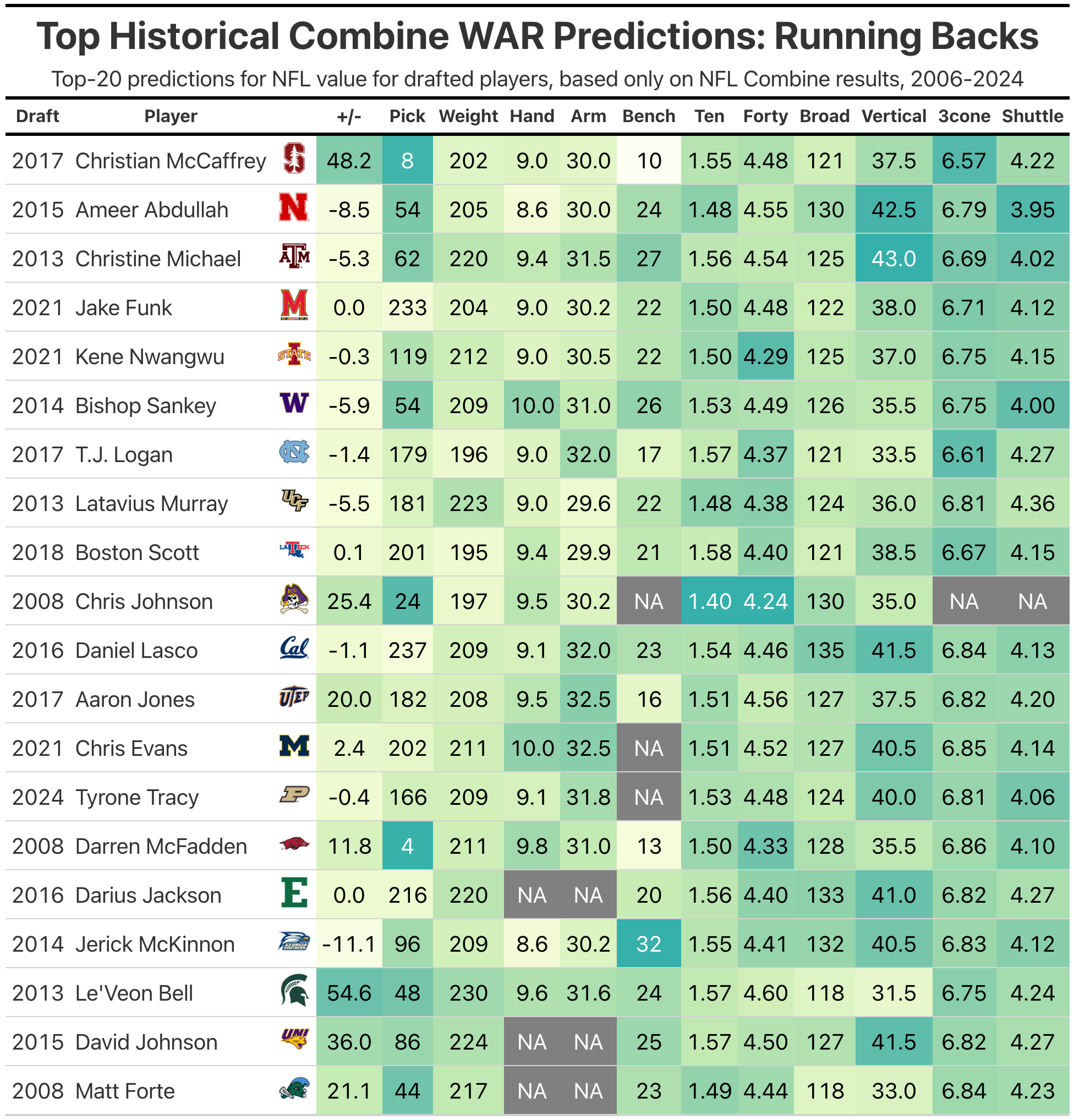Generally, athletic testing has a much bigger effect on draft position for running backs than NFL value in the form of Plus/Minus. In fact, weight and speed weaker correlations to NFL value, but huge effects on draft position.