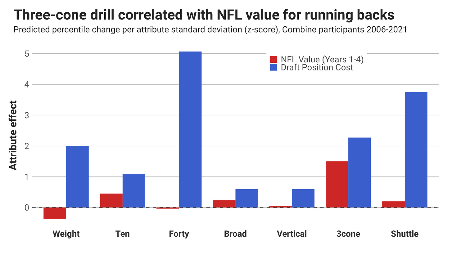 However, running back prospect three-cone times have nearly the same correlation for actual value as draft position, making it the most important drill for teams to pay attention to for a relative advantage on the field. The three-cone drill has gained in importance over time, likely due to the increasing importance of receiving for running-back NFL value.