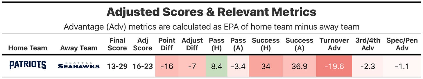Let’s not forget that the Seahawks defense at home allowed Matthew Stafford and the Rams offense to post 93rd percentile EPA efficiency two weeks ago. The Seahawks defense isn’t unsolvable, but the solution was hidden so deep that the Patriots couldn’t find an answer, the best outcome for great defense play and coaching.