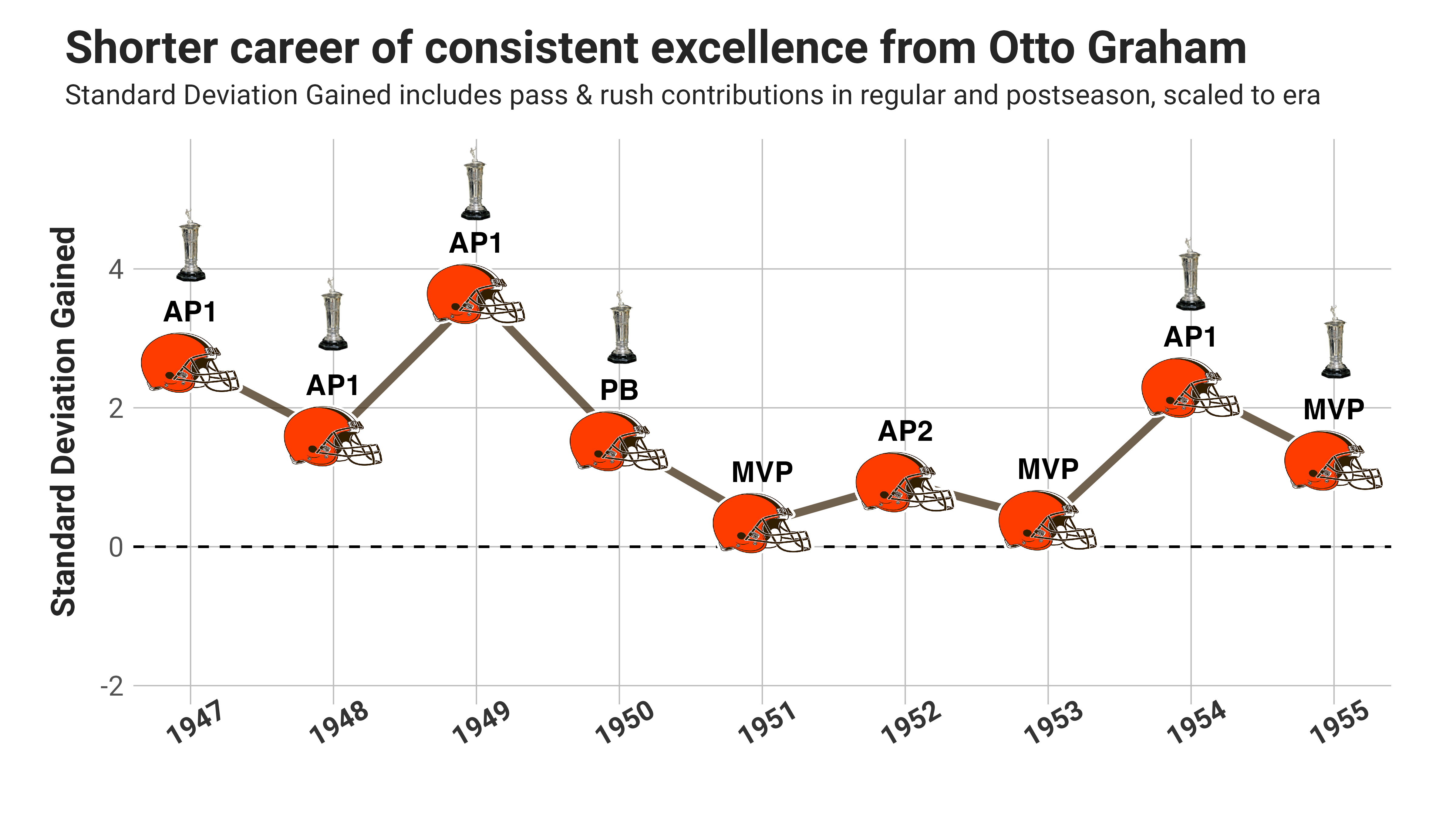 On the career plots, you’ll see indications for Pro Bowl (PB), All-Pro Second-Team (AP2), All-Pro First-Team (AP1) and Most Valuable Player (MVP) regular seasons. I’ve also added an image of the Super Bowl trophy for championship seasons.