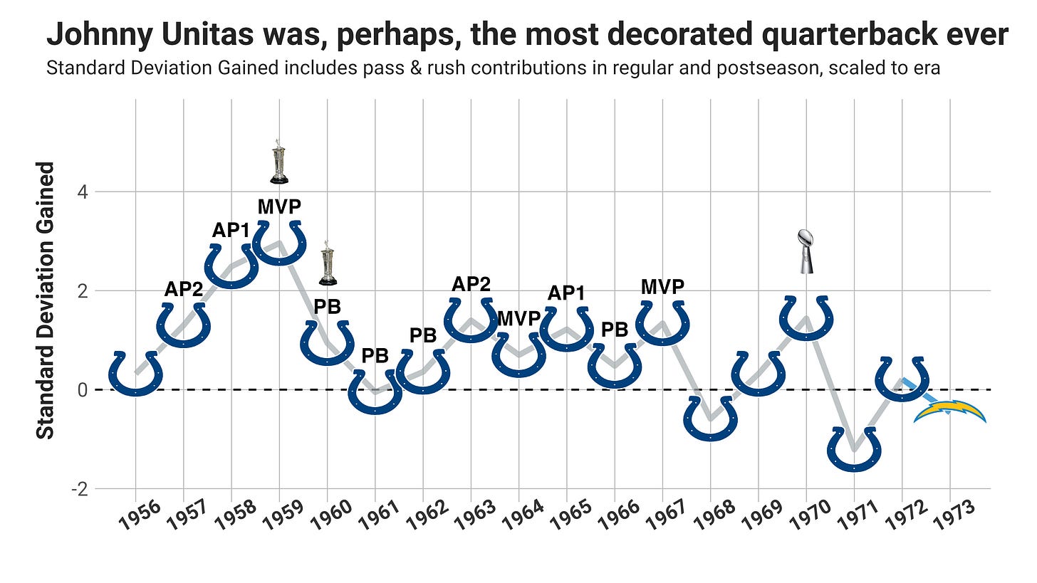 Unitas began his career adding value in 12 straight seasons, winning three MVPs and selected as First-Team All Pro in another two seasons. Unitas seven All-Pro seasons ranks second to only Peyton Manning (10). Unitas led the NFL in passing efficiency (ANY/A) four times, with a total of eight seasons in the top-3.