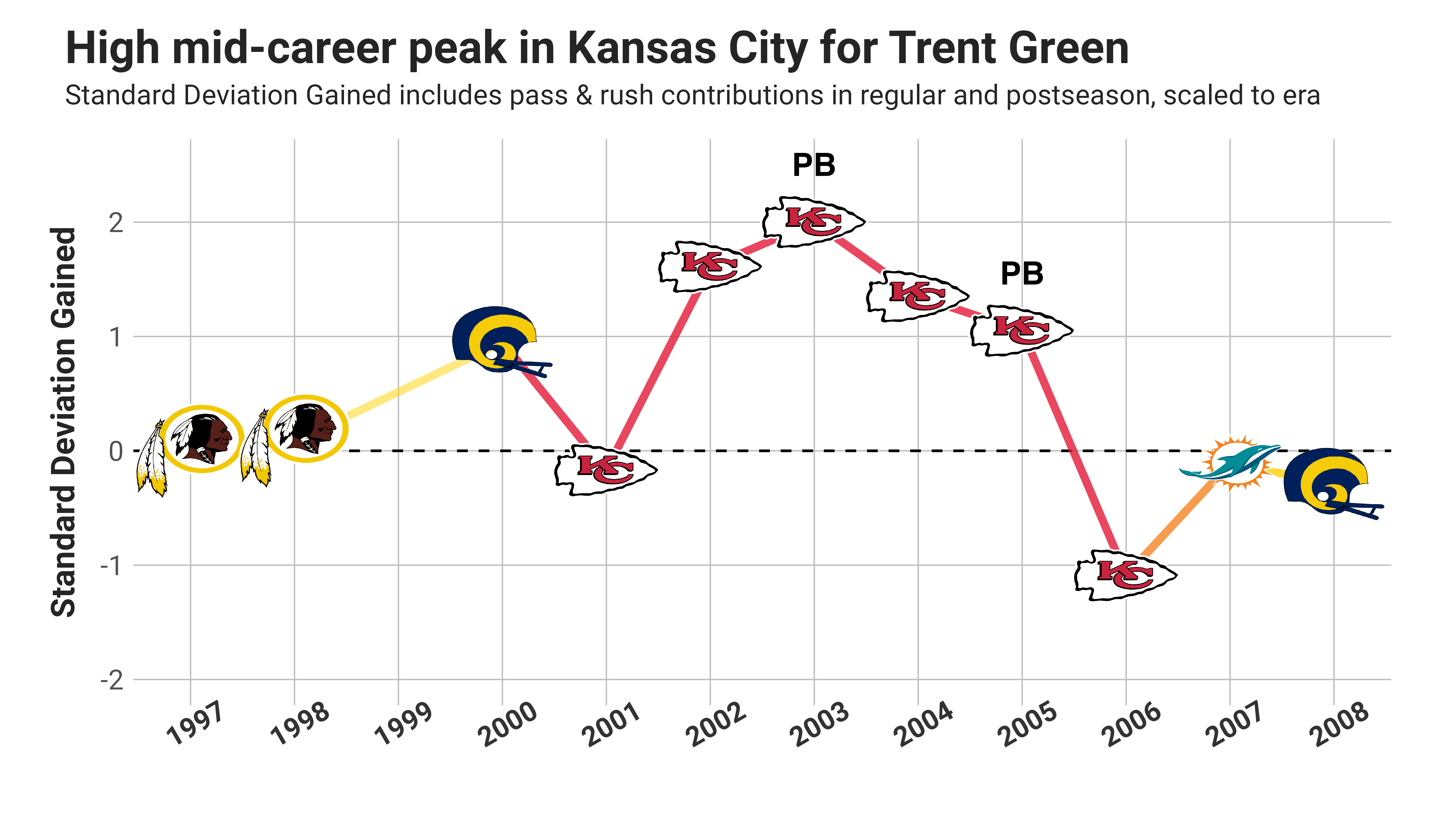 Green was a free agent after the 1999 season, but missed the entire year after a serious knee injury in the preseason, and Kurt Warner stepped in to win MVP and lead the Rams to the Super Bowl. Green was then shifted to Warner’s back, but performed well in five starts when Warner broke his hand, posting 7.6 ANY/A (only marginally lower than Warner’s NFL-best 8.0). In fact, Green showed so much promise between unlucky events that the Chiefs parted with the 12th overall pick to acquire him from the Rams in 2001.