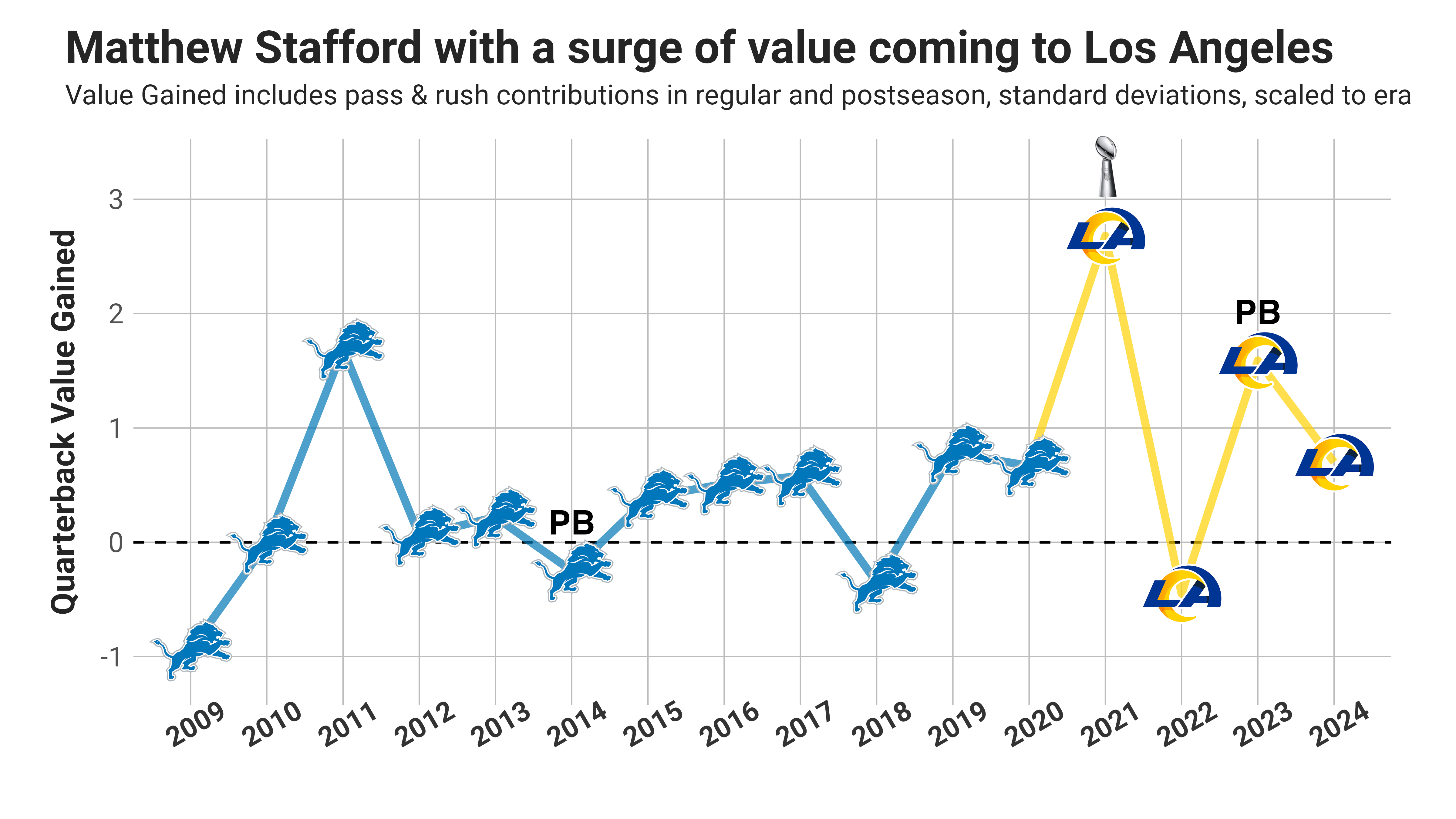 On the career plots, you’ll see indications for Pro Bowl (PB), All-Pro Second-Team (AP2), All-Pro First-Team (AP1) and Most Valuable Player (MVP) regular seasons. I’ve also added an image of the Super Bowl trophy for championship seasons.