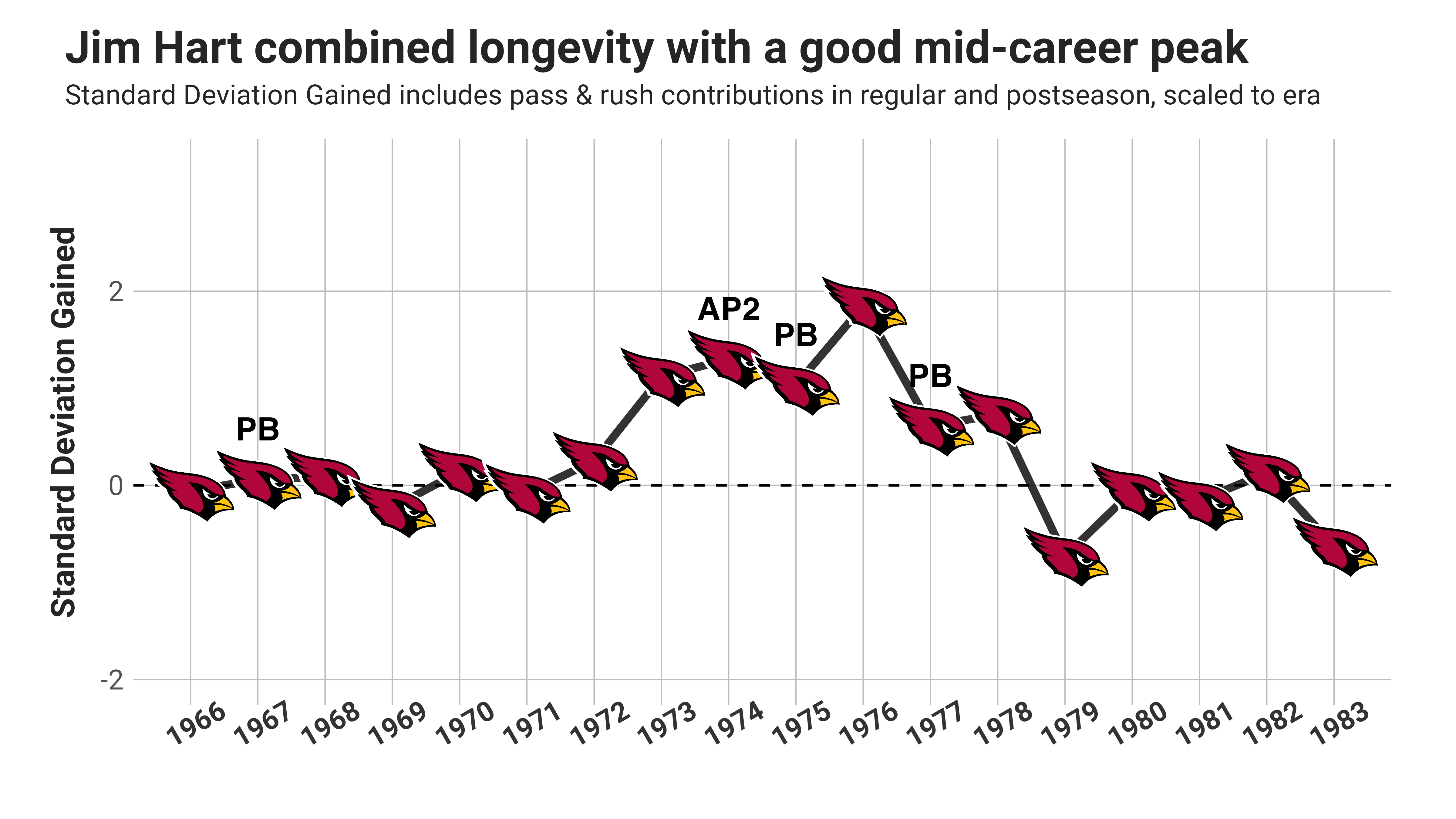 Jim Hart embodied longevity with his staying in the NFL for 19 years through age 40. When Hart retired in 1984, his 34,655 career passing yards was the second most in league history, trailing only Fran Tarkenton. In a way, Hart fell into his long career, going undrafted in 1966 after three years starting for the Southern Illinois Salukis and joining the Cardinals after an impromptu tryout. Hart took over as starter in his second season after getting reps the previous season when Charley Johnson left to fulfill ROTC commitments.