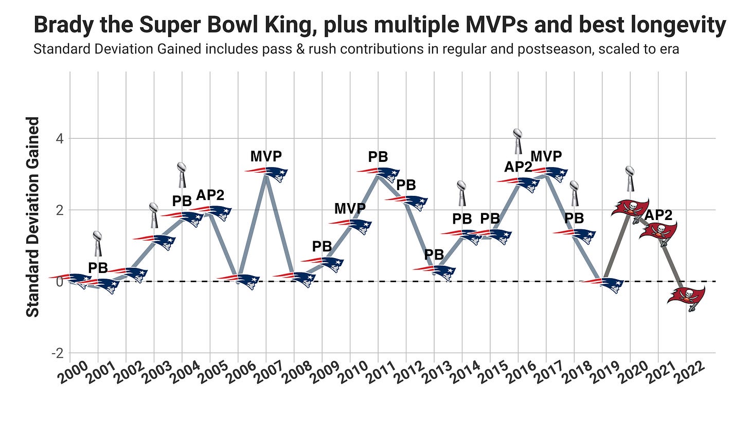 On the career plots, you’ll see indications for Pro Bowl (PB), All-Pro Second-Team (AP2), All-Pro First-Team (AP1) and Most Valuable Player (MVP) regular seasons. I’ve also added an image of the Super Bowl trophy for championship seasons.