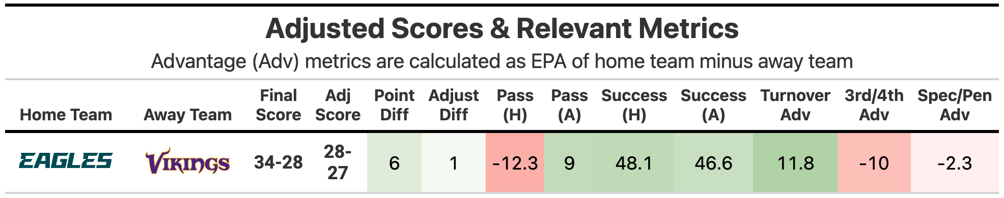 I was surprised to see that the Vikings didn’t continue their mission to be adjusted-score winner and actual losers all this season, as was the case in Week 1 against the Bucs. Here the adjusted scores have a narrowed result still leaning towards the Eagles. The Eagles had the better success rate, though heavily skewed towards lower-upside rushes (62.2% run success versus 31.2% dropping back to pass).