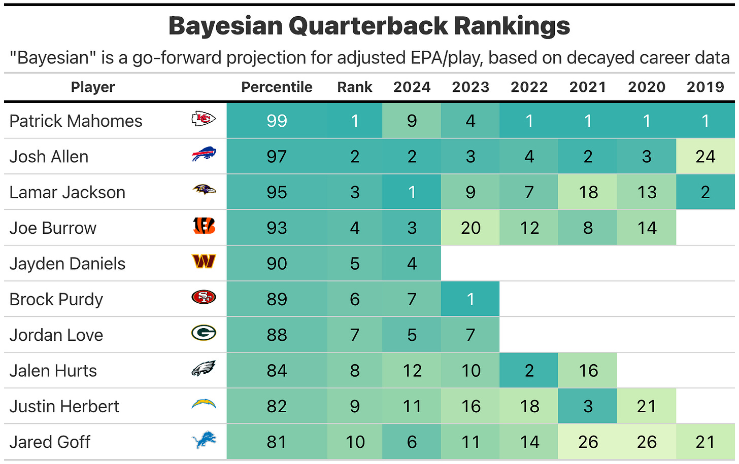 The top-10 hasn’t changed a lot from the end of last regular season, though the year-over-year model adjustments can move quarterbacks up-and-down based on playoff performance, expected jumps in baseline efficiency from rookie-to-sophomore seasons and, for a handful of quarterbacks, aging concerns.