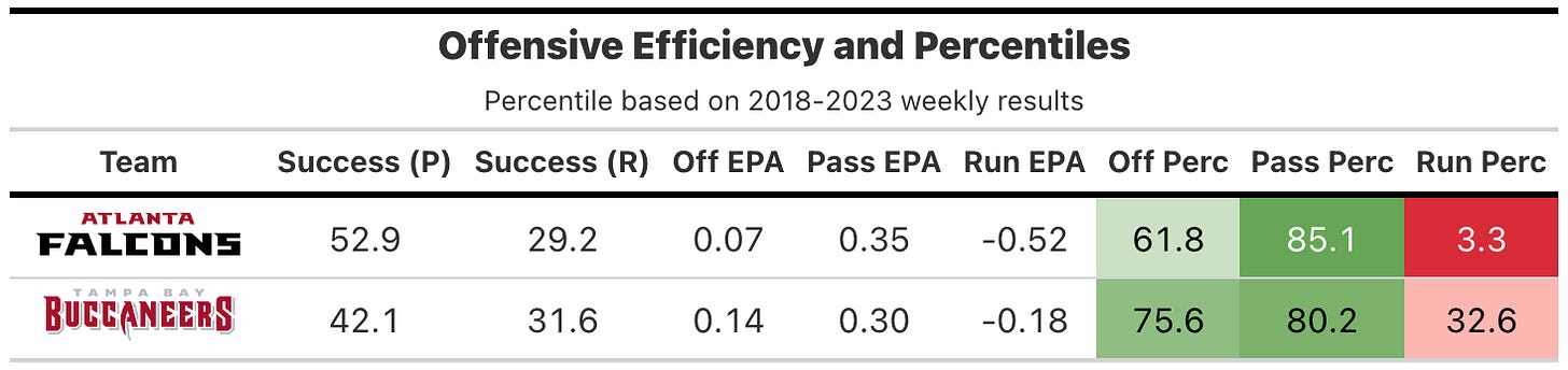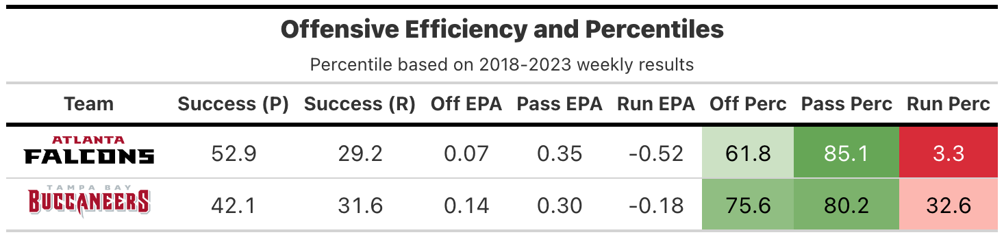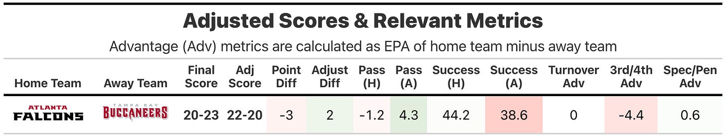 The adjusted scores saw the Atlanta Falcons as the better team, with a marginally better offensive success rate (44% to 39%) and yards per play (5.0 to 4.6). The Tampa Bay Buccaneers won the game by being slightly better on the downs where it counts (converted 50% of third downs and 1-for-1 on fourth versus 40% and 1-for-2).