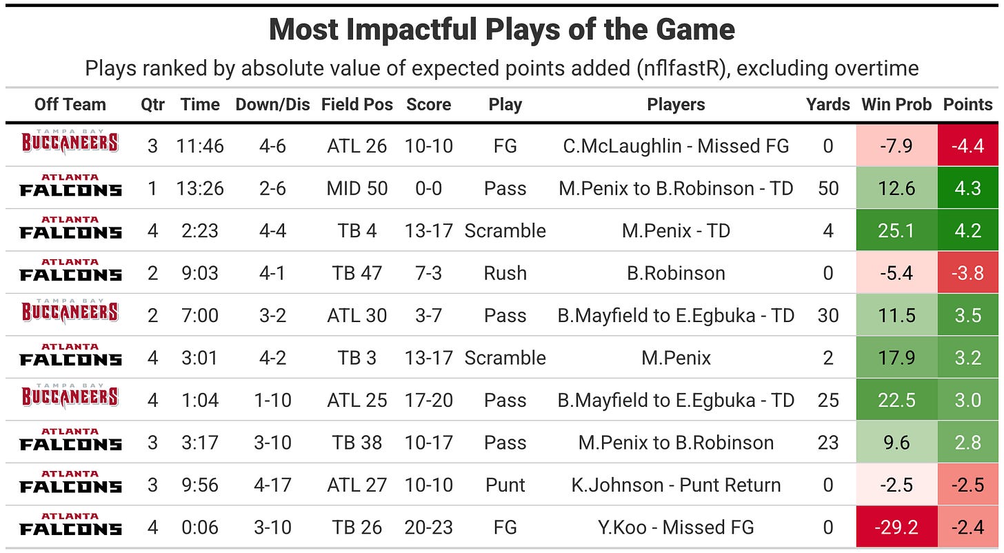 Most people will likely remember the game-tying miss from Younghoe Koo as time expired, but the Bucs also suffered a missed kick in earlier this game that cost them even more in EPA loss (because of the field position gain for the opponent post-kick).