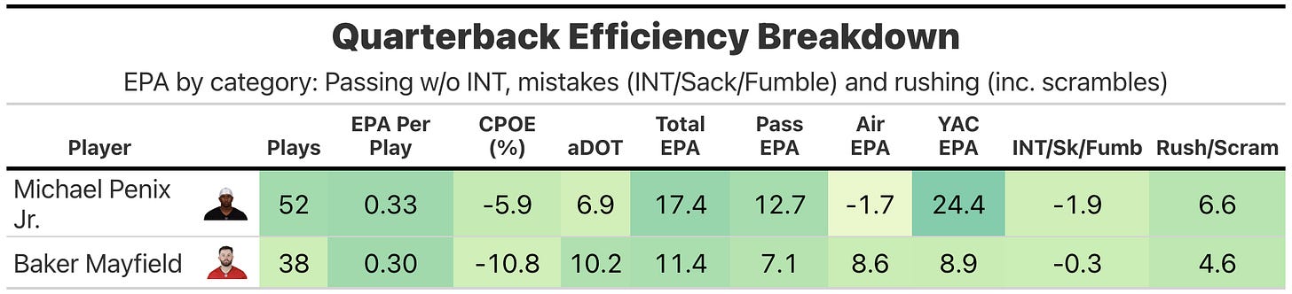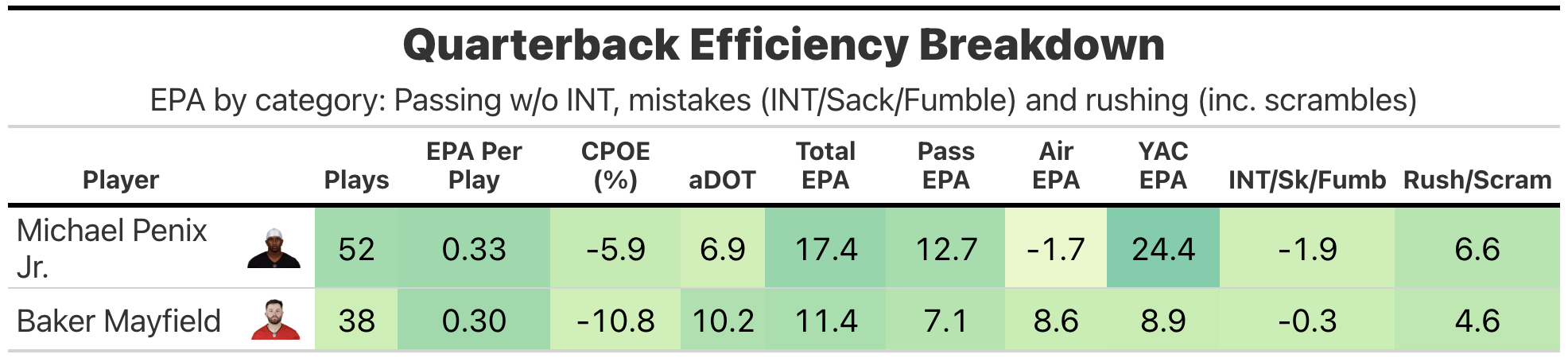 Bijan Robinson had a big game receiving in this contest, but the Falcons were horrible on the ground, losing -0.51 EPA per designed run, without losing any big value chunks to fumbles. Robinson and Tyler Allgeier combined for 48 rushing yards on 22 carries (2.2 YPC). The Bucs weren’t good on the ground, but significantly better than their opponents.
