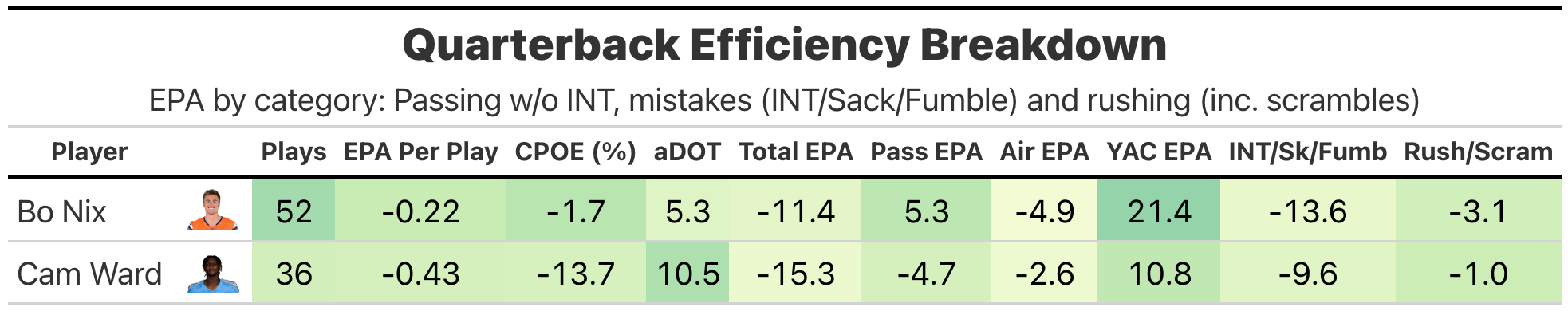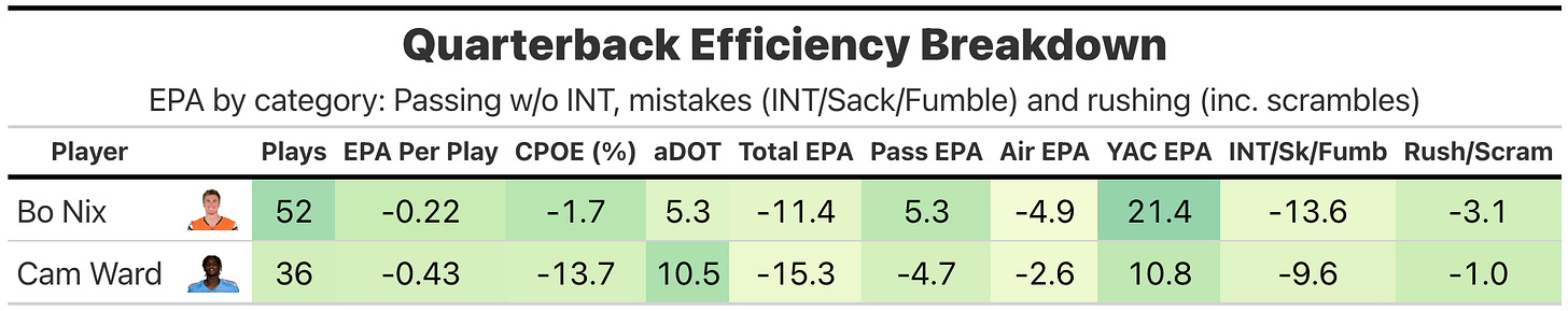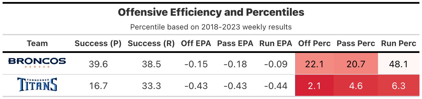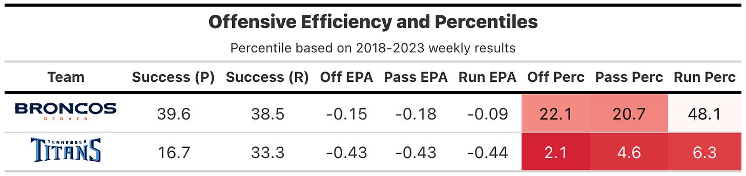 The Titans 22% offensive success rate would have ranked as the fourth lowest for any offensive during the entire 2024 season. Their passing success rate of 16.7% was worse than any team posted all of last year. The Titans hit the 2nd percentile in offensive efficiency (-0.43 EPA per play), and that’s with only a bad-but-not-horrific two turnovers.