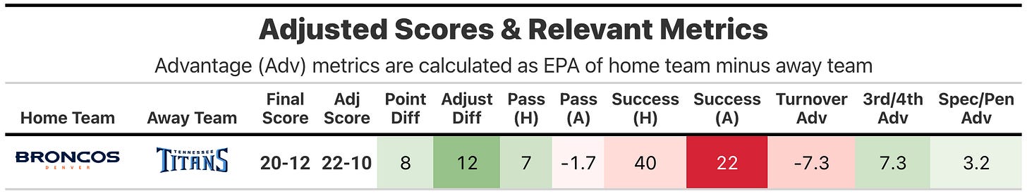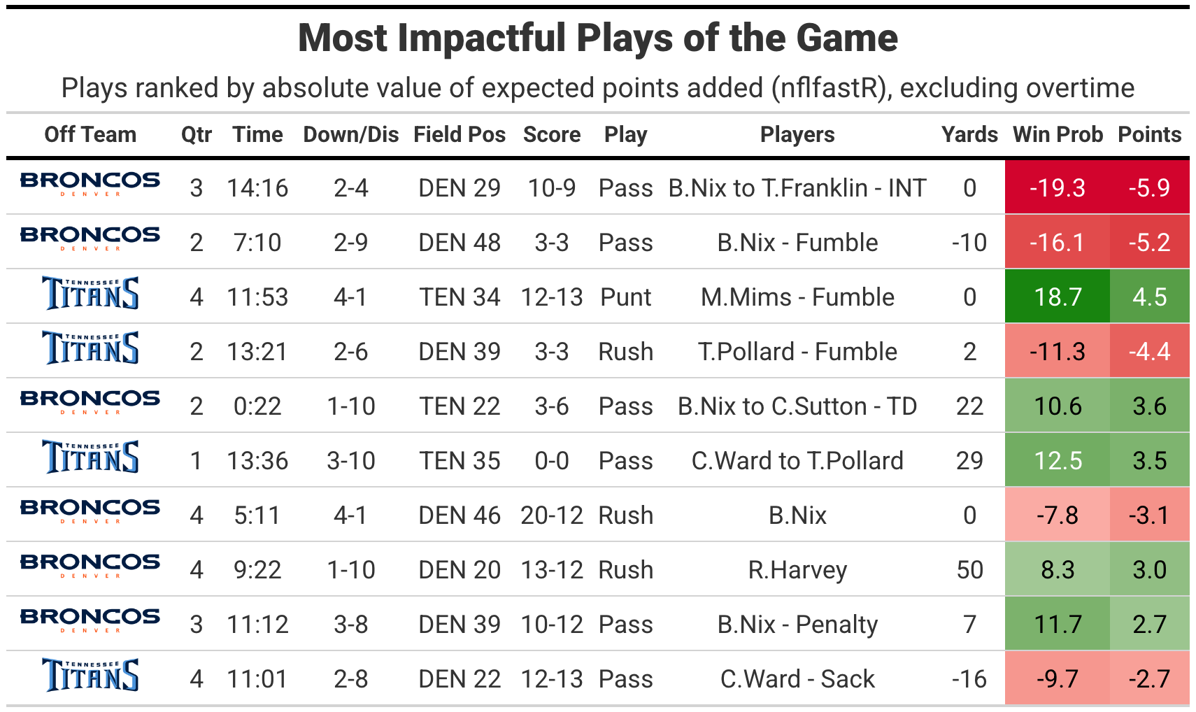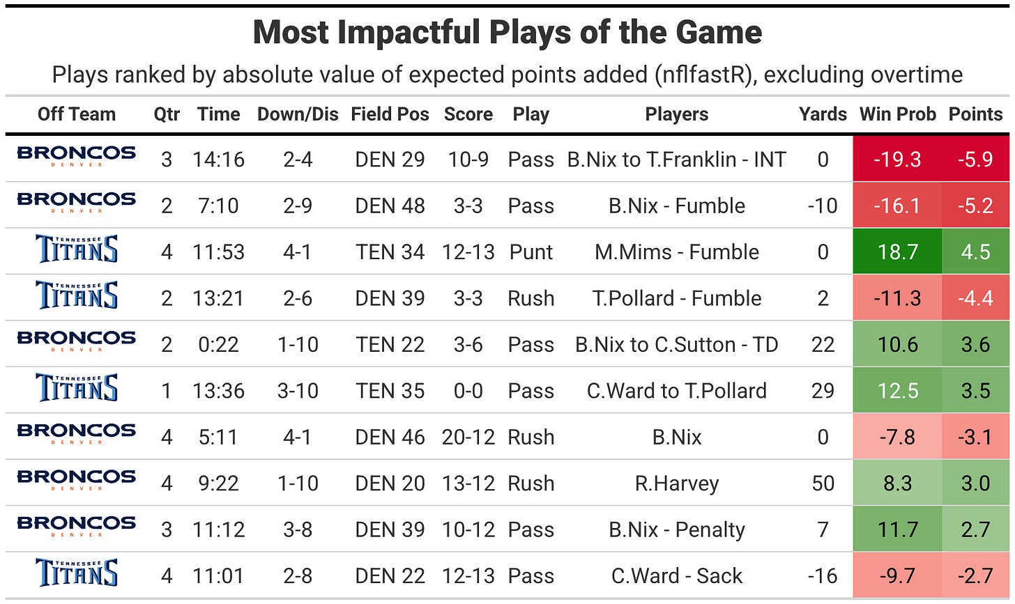 The two biggest impact plays of the game were an interception and strip sack from Bo Nix, dragging down the Broncos’ passing offense. The third most impactful play was a muffed punt from Marvin Mims, which set the Titans up in field-goal range down only one point. Somehow the Titans moved backwards 25 yards and got zero points on the drive. The Titans had drives totaling 0, 0, -3, -4, -6, and -25 yards in the game.