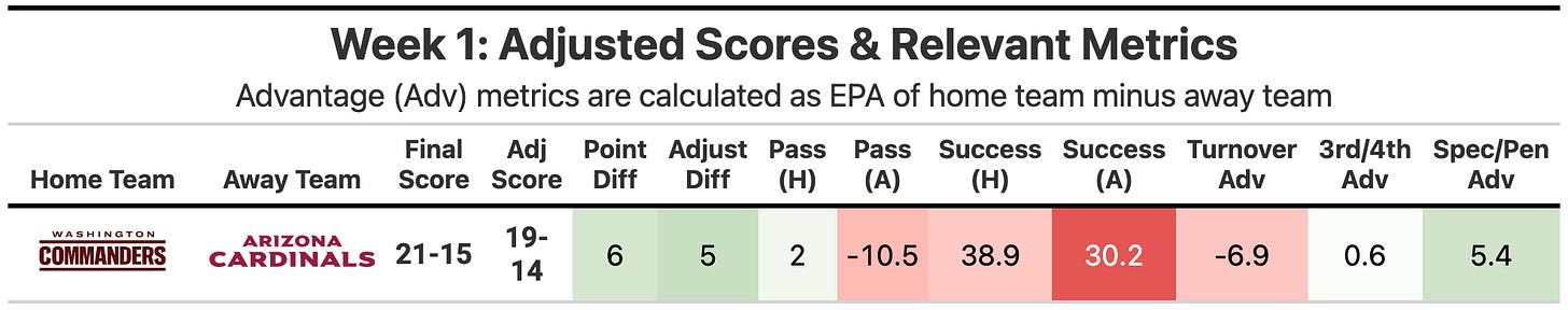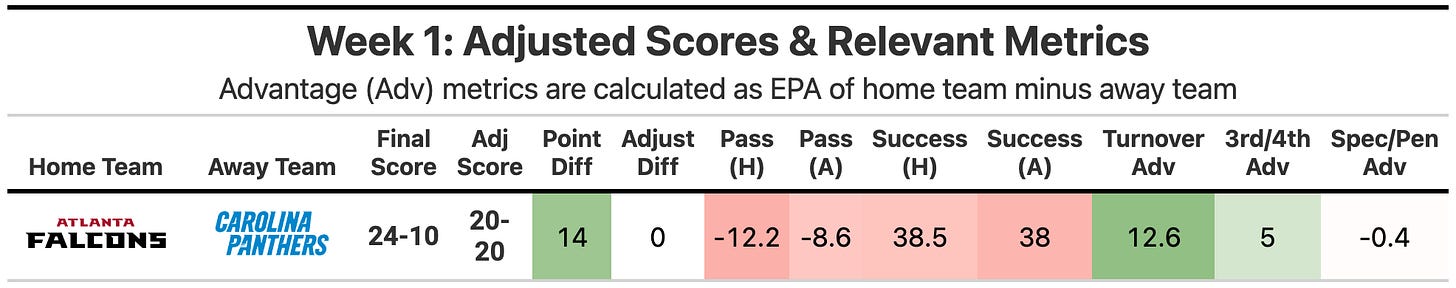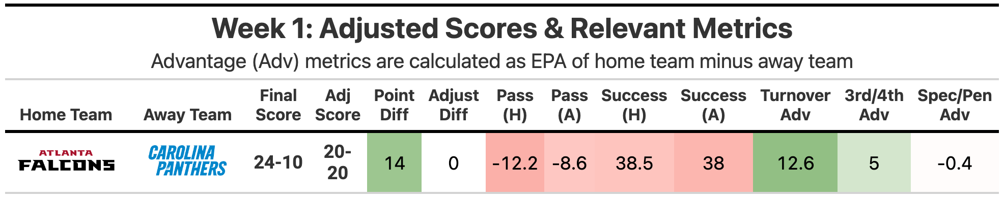 The adjusted scores have this one as basically a draw, a much different result than the 14-point differential in the actual score. The Carolina Panthers were inept on offense, but actually were a bit better in success rate, a major driver of the adjusted score model. The Atlanta Falcons benefited greatly from turnovers, a Miles Sanders fumble and two Bryce Young interceptions. Plus, the Panthers failed on 4th & 1 on the Falcons’ 12 yard-line, costing them 4.1 EPA.