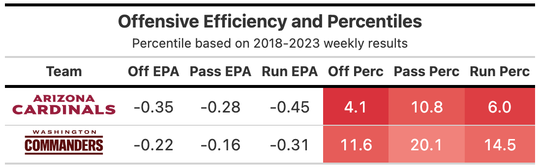 The Cardinals total offensive efficiency was below the fifth percentile, but the Commanders weren’t much better, barely breaking the 10th.